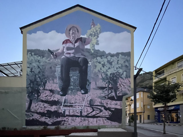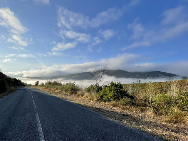 Wir sind dann das Stück des Weges zusammen gegangen, das ganz offiziell auf der Landstraße verläuft. Da, wo der Camino abbiegt, habe ich ihm verkündet, dass ich auf der Straße weiterlaufen und nicht den ausgeschilderten Weg nehmen werde. Die Straße, die wie die gestrige gut asphaltiert und kaum benutzt ist, führt mehrmals in großen Schleifen bis auf 450 m hoch. Das ist mir hoch genug. Der holprige Weg macht das Gleiche, aber in bis zu 600 m Höhe. Das muss ich mir nicht antun. Zu sehen gibt es von da oben auch nicht mehr. Auch von der Straße hat man einen großartigen Blick ins Tal, den ich bei einigen Pausen genossen habe.