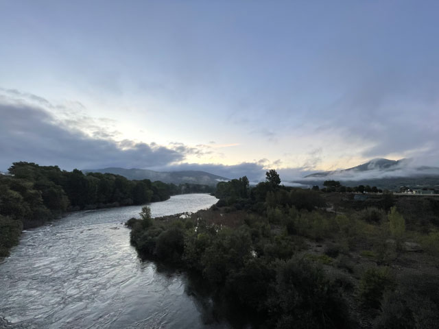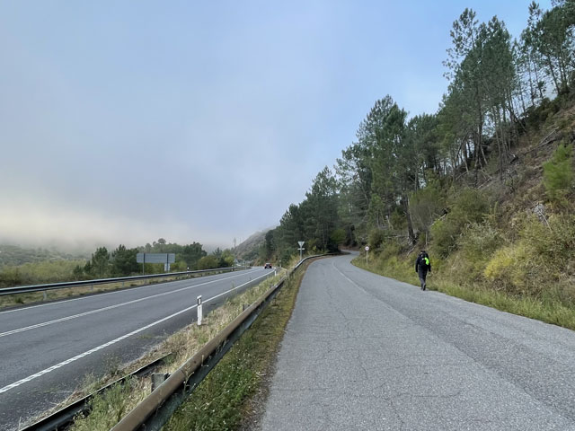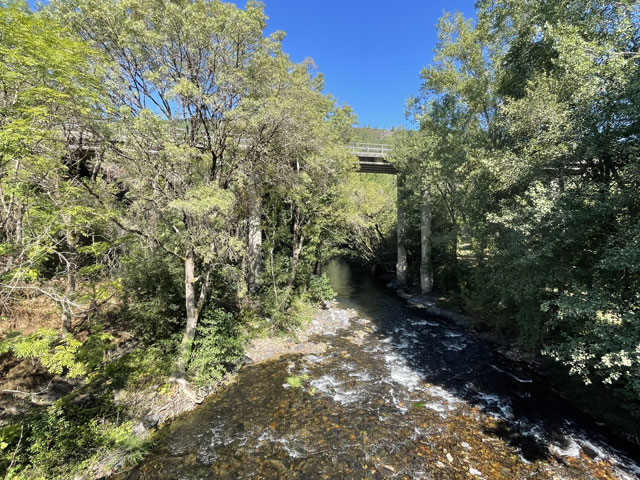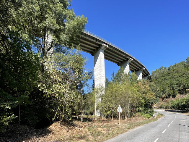 Hätte es an der Straße am Rande dieses Tals eine Bank gegeben, so hätte ich mich langgelegt, die Sicht genossen und auch gleich ein Nickerchen gemacht. Aber so musste ich mich bald erheben, damit die Leitplanke keine Querkerbe im Gesäß hinterlässt. Weiter ging es, stets auf und ab, aber sehr moderat. Mal verlief die Straße über oder neben der N-120, dann mal weit unter dieser, nämlich als diese auf einer hohen Brücke ein Tal überspannt.