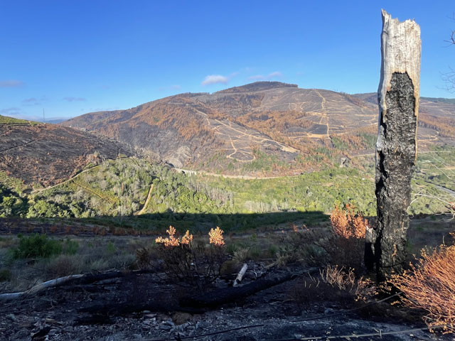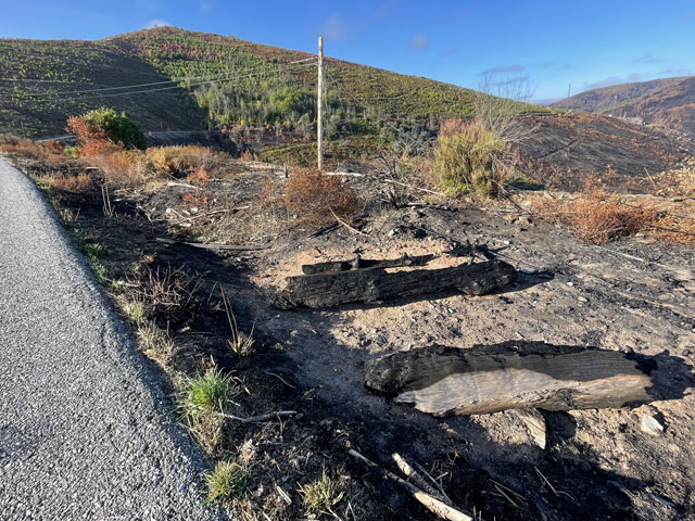 Die Bahnlinie, die hier durch das verbrannte Gebiet führt, ist übrigens nicht stillgelegt, sondern wird trotz der Brände noch oder schon wieder bedient. Während ich das Tal inspizierte, kam nämlich auf der eingleisigen Strecke ein Hochgeschwindigkeitszug AVE, vergleichbar mit unserem ICE, allerdings sehr, sehr langsam, weil offenbar Bauarbeiter an der Strecke tätig waren, was aber wohl nicht mit dem Brand, sondern mit einem Tunnelbau zu tun hatte. Bei uns hätte nach einem solchen Brand alles für Monate oder Jahre still gestanden. Erinnert sei da an den Triebwagenbrand in Ahrensfelde, bei dem ein paar Blechtafeln des Bahnsteigdachs verbeult wurden und Lampenkabel durchgeschmort sind. Da fuhr über Monate kein Zug.
