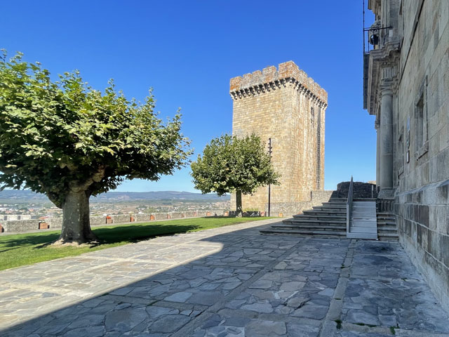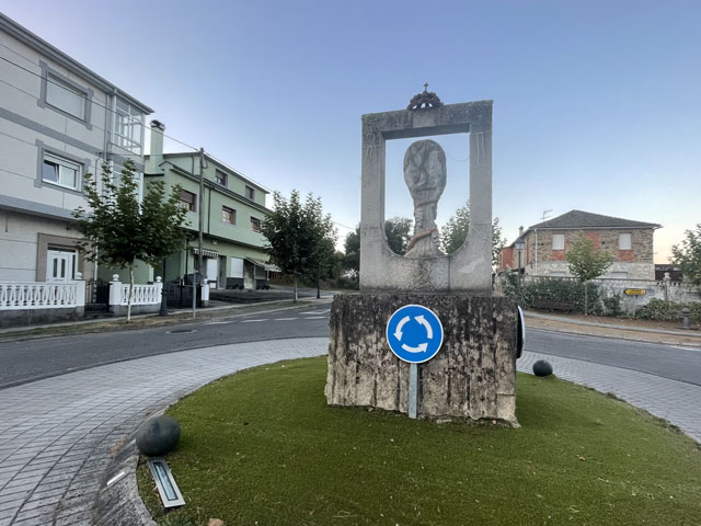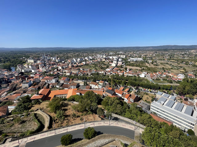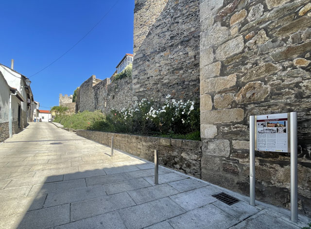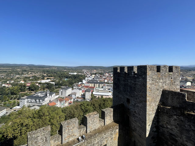 Der Ort umschließt praktisch die auf einem kegelförmigen Berg gelegene Burg, von der aber nur ein paar Mauern und ein zu besteigender Turm übrig sind. Da ich heute noch nicht so viele Höhenmeter hatte, bin ich nicht nur hoch zur Burg, sondern auch noch auf den Turm gestiegen. So richtig gelohnt hat sich das nicht, denn den wirklich tollen Rundumblick auf die Stadt hatte man auch vom Fuß des Turmes. In den Zwischengeschossen des Turms standen ein paar Blechmänner und wenige alte Möbel rum. An dem Wänden hingen einige Tafeln mit Erklärungen zur Geschichte von Stadt und Burg, sogar zweisprachig: Spanisch und Gallego (Galicisch). Da konnte ich nicht viel mit anfangen.