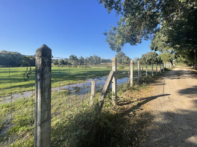 Die heutige Etappe war nicht nur kurz, sondern in jeder Hinsicht sehr normal. Es ging nur anfangs mal über einen Hügel, ansonsten verlief der Weg sehr flach, zunächst entlang eines kleinen, sich durch die Landschaft windenden Flusses, später durch Felder und Gärten. Da es hier flach ist, wird richtige Feldwirtschaft betrieben. Auf den abgeernteten Feldern liegen die großen Strohballen herum und an den Wegen stehen Apfelbäume. Die Häuser sind größtenteils sehr ordentlich - viel Unterschied zu Dörfern in unserer Gegend kann man hier gar nicht ausmachen. Verschwunden sind auch die in den vergangenen Tagen immer wieder gesichteten Bäume mit exotischen Früchten wie Feigen, Kiwis und Granatäpfeln.