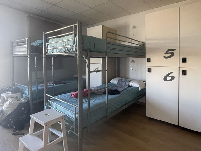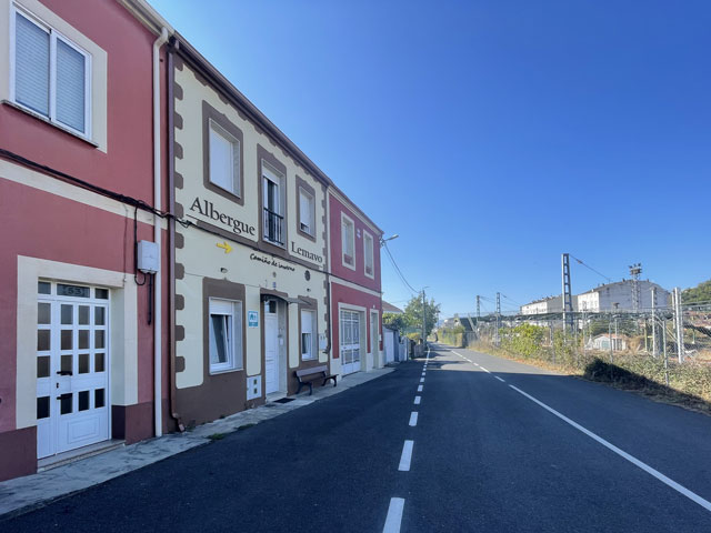 Ein paar Minuten vor zwölf war ich schon am Ziel, d.h. in der privaten Herberge „Lemavo“ in Monforte de Lemos. Die ist in einem alten, schmalen, aber gut hergerichteten „Reihenhaus“ gegenüber dem Bahnhof und wird von einer älteren Dame betrieben, die im Erdgeschoss oder in einem Nebengelass wohnt. Im Erdgeschoss gibt es mindestens ein zu vermietendes Doppelzimmer und im Obergeschoss ist die sehr ordentliche, kleine Herberge mit 14 Betten, zwei sehr modernen Bädern und einer kleinen Küche. Es gibt große Schließfächer, in die problemlos der ganze Rucksack passen würde, und richtige Bettwäsche. 15 € sind dafür nicht zu viel verlangt. Einige der Doppelstockbetten sind hier übrigens „Familienbetten“ mit einem breiten „Untergeschoss“ für zwei. Das kennt man noch aus Etap-Hotels.