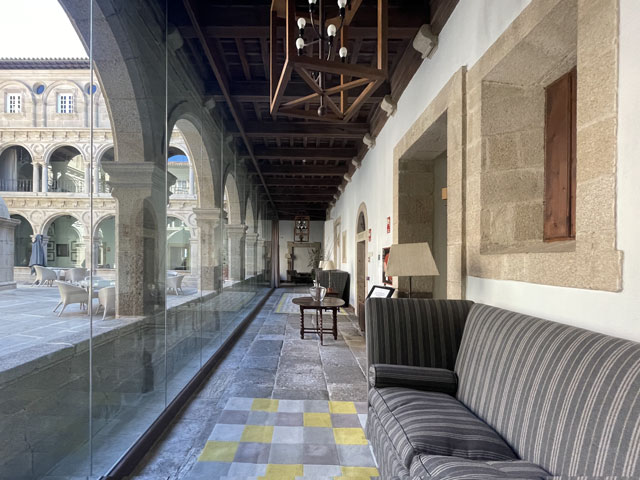 Neben dem Turm ist in einem ehemaligen Kloster ein 5-Sterne-Parador-Hotel. Da bin ich einfach mal rein. Reiche Amerikaner laufen hier mitunter genauso zerlumpt rum, da bin ich nicht aufgefallen. Wie es sich für ein Kloster gehört, gibt es einen Innenhof mit Kreuzgang, also einen Innenhof mit Arkaden auf allen vier Seiten. Da stehen riesige Sofas rum, auf denen man sich nach vollbrachtem Diner mit einem Glas Schampus niederlassen kann, sowie ein paar sicher wertvolle alte Möbel. Im Innenhof kann man an einem der kleinen Tische genüsslich an einer Limonade oder einem Aperol nippen. Man sieht da zwar nicht viel, aber man wird gesehen. Die dazugehörige Kirche habe ich wie die anderen Kirchen der Stadt leider nicht besichtigen können.