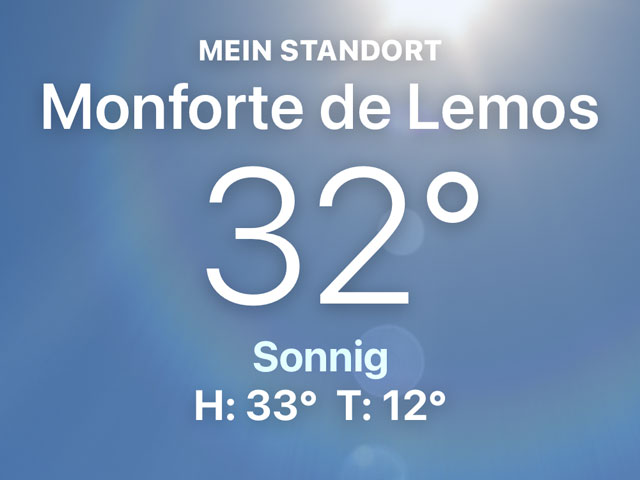 Heute stand nur eine sehr kurze Etappe auf dem Programm: 12,5 km von A Pobra de Brollón nach Monfonte de Lemos. Da habe ich natürlich recherchiert, ob man nicht einen Teil der morgigen Etappe dazuschlagen kann. Aber auf der nächsten, mit gut 30 km recht langen Etappe gibt es erst kurz vor dem Schluss die Möglichkeit, Quartier zu nehmen und damit die Etappe zu teilen. Aber da heute 32 Grad werden sollen, muss man nicht mehr laufen, als unbedingt erforderlich.