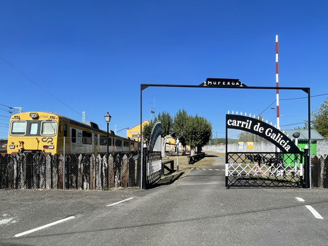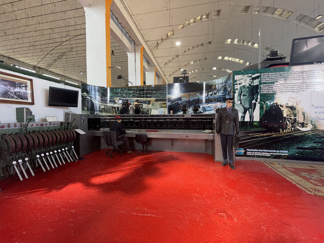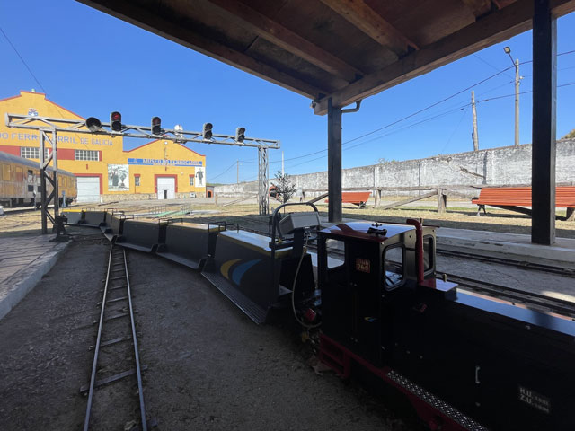 Apropos Krieg: Unter den Wagen war auch ein Plattenwagen mit einem Panzer oben drauf, ebenfalls sehr blank poliert. Außer den Fahrzeugen gab es noch große Schalttafeln, u.a. mit der ganzen Strecke Ourense-Santiago-Coruna, Signaltechnik, Elektro- und Telegrafenanlagen, Eisenbahnmodelle und sogar eine Uhrenausstellung. Alles sehr nett arrangiert und mit passend gekleideten Schaufensterpuppen versehen. Auf dem Freigelände standen noch ein paar zu restaurierende Waggons rum. Ich bin extra bis ans Ende des Geländes gelaufen, weil ich dort den Lokschuppen entdeckt habe, den ich schon auf Fotos gesehen hatte. Aber der war leider nicht zugänglich.