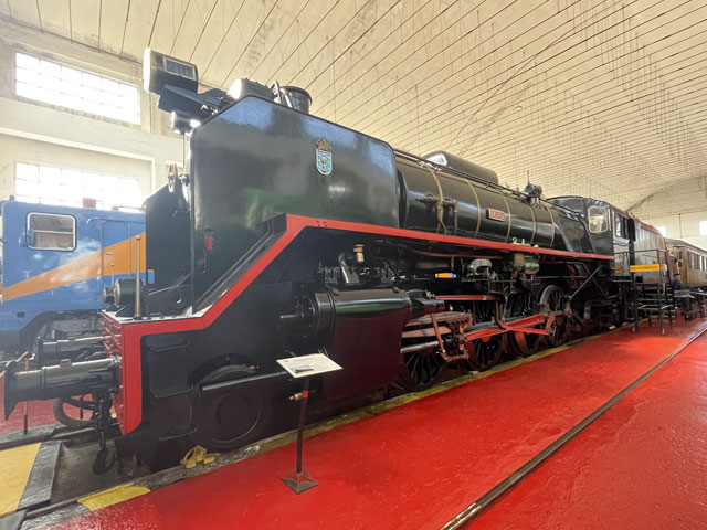 Also bin ich allein raus in die Hitze (32 Grad) und ins gut zwanzig Minuten entfernte „Museo do Ferrocarril de Galicia“, also in das Galicische Eisenbahnmuseum. Das befindet sich in einer großen, ehemaligen Wartungshalle. Dort stehen auf mehreren Gleisen Lokomotiven und Eisenbahnwagen. Es sind nicht sehr viele, aber sie stellen eine gute Auswahl dar und sind wunderbar restauriert und gepflegt. Bei den Lokomotiven fasziniert eine riesige, blank polierte Dampflok, die 1952 in Glasgow gebaut wurde. Da konnte man auch in den Führerstand, der sehr geräumig und gut aufgeräumt ist. Da habe ich sinniert, wie denn der Heizer die Kohle aus dem Tender bekommt, denn da war keine Klappe, in die er mit seiner Schaufel fahren könnte. Das hat mir keine Ruhe gelassen und nach erneutem Absuchen des Tenders habe ich mir jemand vom Museumspersonal geholt. Der junge Mann hat mir dann erklärt, dass die Lok mit „Fuel“, also flüssigem Kraftstoff betrieben wurde. Und tatsächlich kamen ja mehrere Rohre mit großen Hähnen aus dem Tender, die unter dem Boden des Führerstandes in die Brennkammer der Lok führten. Im Internet habe ich dann gelesen, dass die Mehrzahl der ca. 250 Loks dieses Typs, die gekauft bzw. in Lizenz gebaut wurden, mit Heizöl betrieben wurde, weil das nach dem Krieg besser verfügbar war als Kohle. Wieder was gelernt: es gibt auch Diesel-Dampfloks!