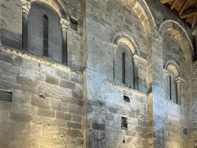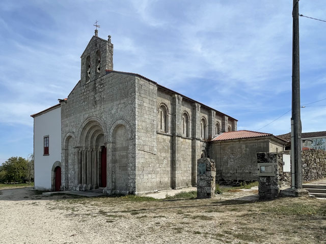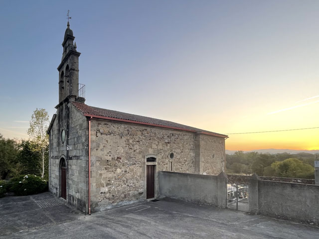 In Diomondi, wo der Camino die Straße verlässt und auf einem holprigen Weg runter ins Tal führt, habe ich mir die dortige Herberge angeschaut. In dem winzigen Dorf gibt es vielleicht fünf Häuser, aber eine romanische Kirche aus dem 12. Jahrhundert und einen angebauten Bischofspalast, wobei hier „Palast“ sehr hoch gegriffen ist. Sagen wir mal, die Kirche hat einen Anbau. In diesen hat ein offenbar renommierter Architekt vor wenigen Jahren für eine Million Euro eine Pilgerherberge eingebaut. Jene, die dort schon mal übernachtet haben, loben den Bau, bemängeln aber, dass es dort nicht mal einen Automaten für Getränke und Essbares gibt. Das muss man sich alles mitbringen und zwar aus dem 23 km entfernten Monforte, wo ich herkam. Ich hatte schon mit den Gedanken gespielt, des tollen Ambientes wegen dort abzusteigen und morgen früh dann ausgeruht den strapaziösen Ab- und Aufstieg runter zum Río Miño und wieder hoch nach Chantada in Angriff zu nehmen. Aber ich hatte nichts zum Essen dabei und ab 14 Uhr für den Rest des Tages Wasser zu trinken und mich im Garten zu langweilen, war auch nicht mein Verlangen. Aber anschauen wollte ich mir wenigstens Kirche und Herberge.