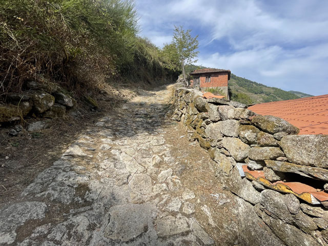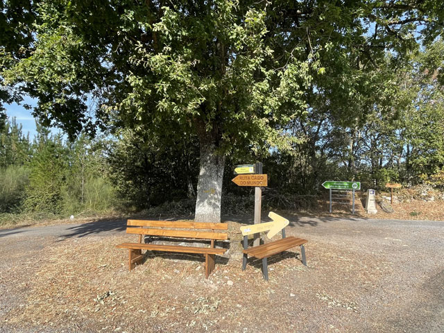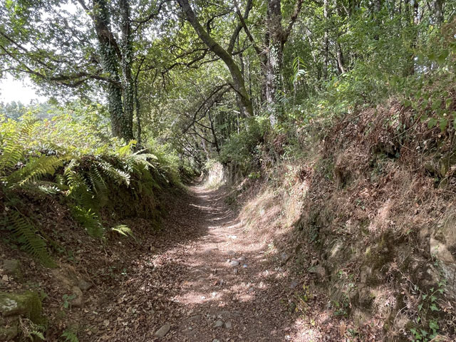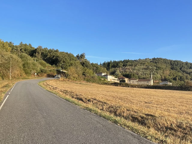 Dann ging es lange geradeaus, wobei die Bebauung immer spärlicher wurde. Auf einer nur wenig befahrenen Straße ging es über den Río Cinsa und zweimal über die Nationalstraße. Dann war ringsum nur noch Natur und die Straße führte langsam, aber stetig bergauf. Da hat mich Margarita, eine nicht mehr ganz junge Portugiesin überholt und sich entschuldigt, dass sie so schnell läuft. Sie hat es nicht so mit den Bergen und da muss sie auf den flachen Strecken noch was rausholen. Da geht es ihr wie mir, nur dass ich auch im Flachen nicht so sonderlich schnell bin. Da Margarita auch Marco überholt hat, der weit vor mir war, muss sie auch in den Bergen einen ordentlichen Schritt zugelegt haben.
