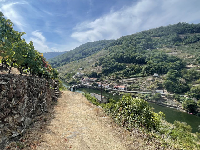 Nach der ersehnten und hier erhaltenen Erfrischung ging es frohen Mutes über die Brücke und rein in den Weinberg. Es gibt eine Straße, die sich in weiten Serpentinen durch die Weinberge hoch bis auf den Kamm zieht. Der Camino geht aber steil bergauf und schneidet die Serpentinen. Man hat also die Wahl zwischen einem langen Weg entlang der Straße mit moderatem Anstieg oder dem ausgeschilderten Camino, der gnadenlos steil bergauf führt. Letztlich bin ich einen Mix davon gelaufen - erst Camino und als mir dann die Zunge bis sonst wohin hing, auch mal ein Stück Straße.