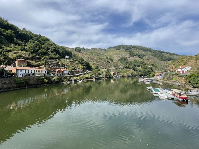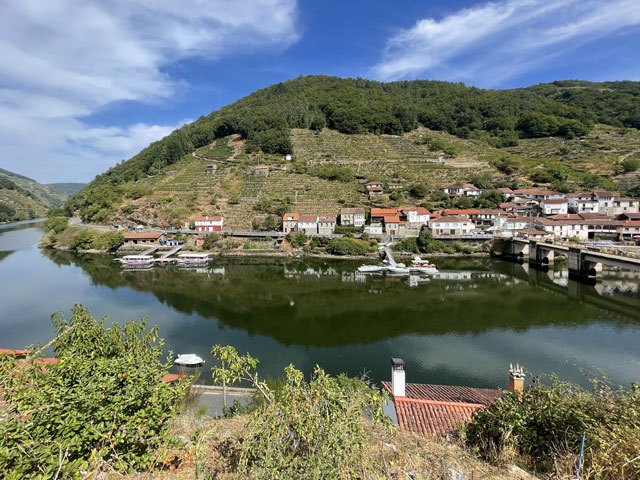 Bevor ich das angehen konnte, brauchte ich unbedingt eine längere Pause. Da traf es sich gut, dass es wider Erwarten unten am Fluss eine Gaststätte gab, die in der Online-Karte gar nicht eingezeichnet, aber in der beim „Standort senden“ verschickten Karte zu sehen ist. Die liegt, ohne Insiderwissen nicht erkennbar, etwas abseits des Camino zwischen der Straße und dem Bootssteg, an dem zwei „Ausflugsdampfer“ auf Fahrgäste warteten.