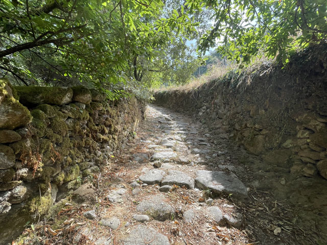 Von Diamondi geht es auf einem steilen Weg im Zickzack am Berghang hinunter ins Tal, von 500 runter auf 200 Meter. Das klingt nicht viel, aber die Beine sind da ganz anderer Meinung. Man kann nicht sagen, dass der Weg gepflastert ist. Da hat mal jemand, wahrscheinlich waren es die Römer, große Felsbrocken nebeneinander gelegt, über die man jetzt abwärts hüpfen muss. Dass dies anstrengend wird, war mir klar, aber ich hätte nie gedacht, dass man für diese 300 Höhenmeter so lange braucht. Als dann vielleicht noch hundert Meter übrig waren, konnte man durch ein paar Lücken im Wald endlich mal runter bis zum Fluss schauen, der da noch so endlos weit entfernt schien.