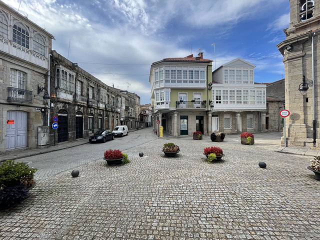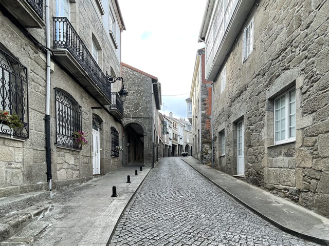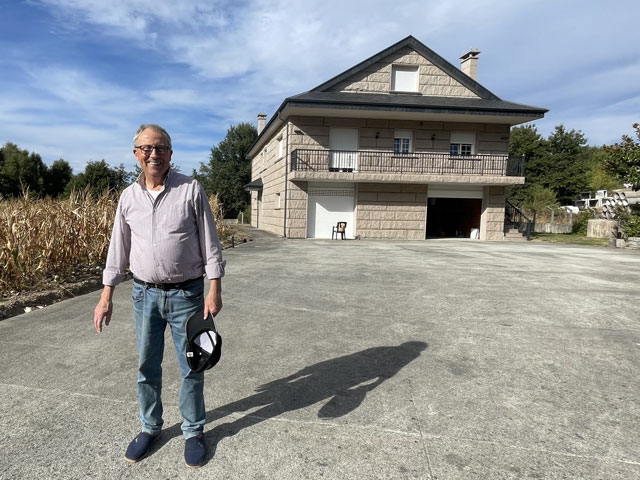Kurz vor dem Ort hat mir jemand von seinem Grundstück aus zugerufen, ob ich Wasser haben will. Das ist mir unterwegs schon wiederholt passiert und ich habe immer freundlich verneint, weil ich genug Wasser mit mir rumgeschleppt habe. Dieses Mal war ich ganz frech und habe auf die Frage „Agua?“ (Wasser) mit „Cerveza!“ (Bier) geantwortet. Der Herr hat mich daraufhin aber nicht weggejagt, sondern per Fernbedienung das Gartentor geöffnet und Zeichen gegeben, dass ich reinkommen soll. Wie sich rausstellte, sprach er (Manuel, 78) sogar ganz gut Deutsch und wir haben uns in seiner riesigen Garage sitzend, prima unterhalten. Er hat zwei Töchter, eine arbeitet in der spanischen Botschaft in Berlin, die andere ist Ärztin in einem großen Hospital in Madrid. Die hat eine 8jährige Tochter, die gut Klavier spielt und schon bei Wettbewerben aufgetreten ist, was er mir mit Videos bewiesen hat. Wir hatten so viel Zeit zum Quatschen, weil Manuel einfiel, dass er gar kein Bier im Kühlschrank hat. Da musste er für ein paar Minuten eine Flasche ins Tiefkühlfach legen, wozu er extra hoch in die Wohnung ist. Zur Überbrückung hat er mir eine Flasche kalten Wassers mitgebracht. Die später aus dem Tiefkühler geholte Flasche mit dem schwarz-roten Etikett, also „Estrella Galicia“, war eine Wohltat. Damit war die Welt sowas von in Ordnung.