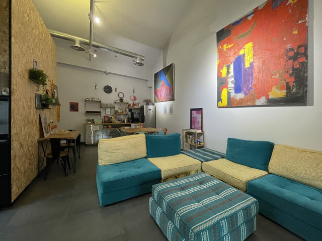 Der Aufenthaltsraum, in den man von draußen tritt, ist mit einer großen, farbigen Sitzecke und einem Esstisch mit bunten Stühlen ausgestattet. Darüber sind silberne Lüftungsrohre und an den Wänden hängen eigenwillige Lampen. Am Ende des Raumes stehen auf einer Küchenzeile Kaffeeautomat, Wasserkocher und Toaster sowie die Zutaten fürs Frühstück. Daneben ist ein großer Kühlschrank. In zwei Wandnischen, die vielleicht einen Meter breit sind, befinden sich zwei Miniküchen mit Ceranfeld, Waschbecken und darüber Abzugshaube und Mikrowelle. Unterm Ceranfeld ist ein Schubfach mit einer umfangreichen Topf- und Pfannenauswahl. Geschirr und Besteck gibt es auch sehr reichlich.