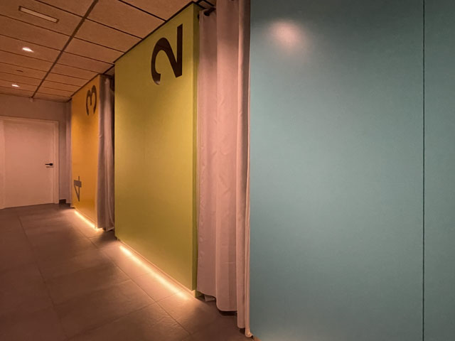 Am Ende sind die beiden „Bettenhäuser“ durch einen Sanitärtrakt verbunden, der sehr ordentliche Waschräume mit ausreichend Duschen und Toiletten enthält, je einen für Damen und Herren. In dem Trakt befinden sich auch Waschmaschine und Trockner, deren Benutzung aber extra kostet. Die Beleuchtung wird hier auch per Bewegungsmelder gesteuert, aber nicht so, dass wie in A Proba im ganzen Flur das Flutlicht angeht, wenn jemand auf dem Weg zur Toilette ist. Stattdessen gehen in den Sockeln der Wände gelbe LED‘s mit warmem Licht an, die den Weg zur Toilette bzw. zum Ausgang völlig hinreichend beleuchten. Hier ist 2022 von einem privaten Betreiber auf kleinstem Raum eine sehr durchdachte und im Detail großzügige Herberge errichtet worden, bei der man wirklich an alles gedacht und für Alles optimale Lösungen gefunden hat.