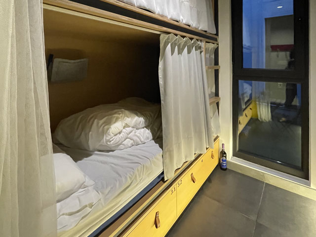 Die Schlafgelegenheiten befinden sich in zwei langgestreckten Gebäudeteilen, die einen schmalen Innenhof einschließen, in dem man gut sitzen und auch seine Wäsche trocknen kann. In den beiden Flügeln gehen von einem Flur vier Kabinen ab, in denen sich 2 bzw. 4 Schlafboxen befinden, alle mit Vorhang, richtig guter Bettwäsche, Licht und USB-Anschluss. Unter den Betten große Schubfächer, die man mit dem als Türöffner ausgehändigten Chip verschließen kann. Zum Flur hin sind die Kabinen mit einem Vorhang verschließbar, auf der anderen Seite zeigt ein bodentiefes Fenster mit Rollladen zum Innenhof.