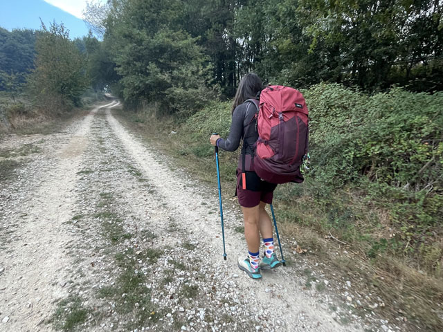 Da Marco zu seinen Gerichten immer nur Wasser nimmt, habe ich die von Manuel geschenkt bekommene Weinflasche zu gelassen. Schön blöd. Ich hätte die mal auf- und ggf. allein niedermachen sollen, dann hätte ich heute vielleicht einen schweren Kopf, aber keinen schweren Rucksack gehabt. So habe ich die Flasche bei sicher nicht optimalen Lagerungsbedingungen über die Berge geschleppt, ohne zu wissen, ob heute jemand in der Herberge ist, mit dem man anstoßen kann. Ich muss sie allerdings wieder auf 8…10 Grad runter kühlen und dabei maximal 20 Minuten in den Kühlschrank legen, wie mir Manuel gestern eindringlich mit auf den Weg gegeben hat.