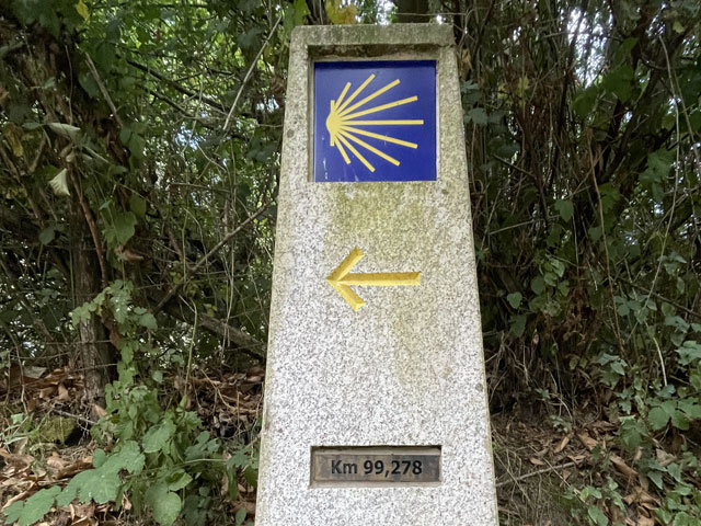 Schon wenige Kilometer nach dem Start hatten wir die 100 km-Marke erreicht. Den ersten Stein mit einer zweistelligen Kilometerangabe bis Santiago wollte ich fotografieren, aber da hatte schon ein Raritätensammler das Messingschild mit der Entfernungsangabe geklaut. Da die Markierungssteine aber etwa alle dreihundert Meter und zusätzlich (!) an jedem Abzweig stehen, war die Chance groß, noch einen mit einer „99“ vor dem Komma zu finden.