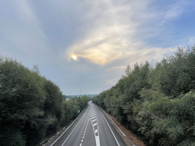 Als wir heute aus der Herberge kamen, war nicht nur hinter uns das ganze Tal, sondern auch das Stadtgebiet von einer stinkenden Wolke bedeckt, so wie bei richtig starkem Smog. Es war jetzt zwar nicht so, dass man Atembeschwerden bekommen hat, aber unangenehm war es doch, in dem Brandgeruch, der wahrscheinlich noch durch den Regen verstärkt wurde, zu laufen.