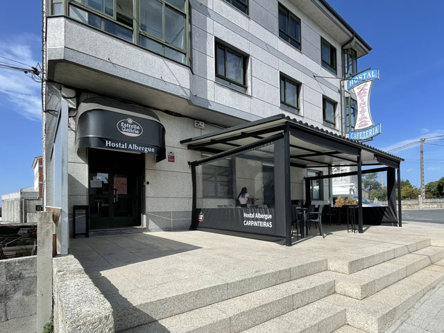 Wir waren in der schönen 28-Betten-Herberge nur zu dritt und wir beide haben erst heute früh mitbekommen, wer der dritte Pilger ist. Als wir beim Frühstück saßen, kam Margarita, die flinke Portugiesin, aus dem anderen Trakt. Marco kannte sie auch schon, da sie gestern nicht nur mich, sondern auch ihn überholt hat. Wir haben noch kurz geplauscht und sind dann gemeinsam losgezogen. Bis zur dritten Häuserecke war ich sogar der Erste!