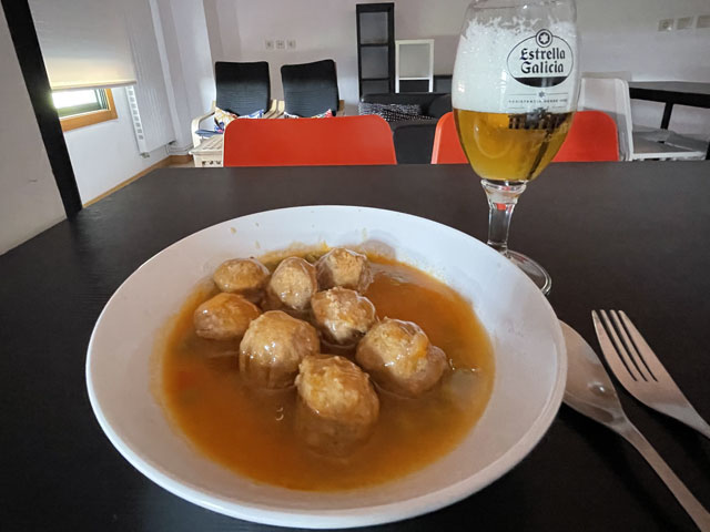 Marco war schon zwanzig vor acht ganz aufgeregt in der Herberge herumgelaufen, so wie ein Kind zu Weihnachten vor dem noch verschlossenen Zimmer mit dem Gabentisch. In der Gaststätte unter uns gibt es nämlich erst ab acht Abendessen. Da er eineinhalb Stunden später mit einem strahlenden Gesicht zurückgekommen ist, muss das Essen gut und reichhaltig gewesen sein.