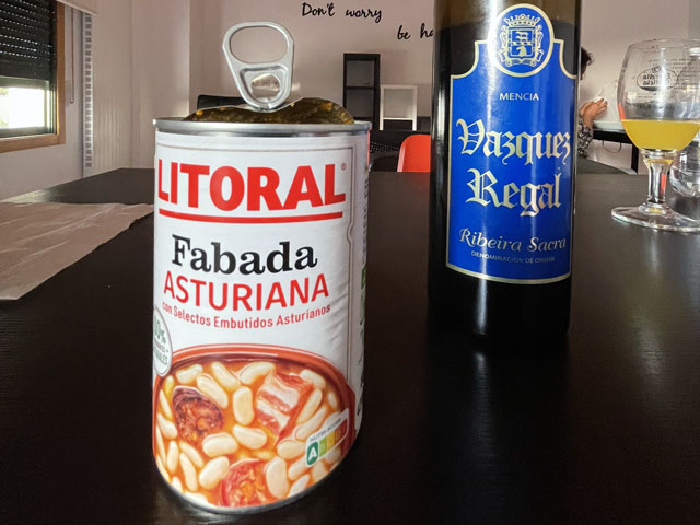 Um es kurz zu machen: Die Flasche „Vazquez Regal“ mit der Nummer 3788621 aus dem Jahre 2015 gibt es nicht mehr. Ich habe mich ihrer sehr fürsorglich angenommen. Manuel sagte mir bei der Übergabe, dass ich diesen edlen Wein aus der „Ribeira Sacra“ mal zu einem guten Essen genießen soll. Dieser Augenblick war heute gekommen. Ich habe mir nämlich im hiesigen Supermarkt eine Büchse weißer asturischer Bohnen mit „Selectos Embutidos Asturianos“, d.h. mit ausgewählten asturischen Würsten besorgt und in der Mikrowelle verzehrfertig gemacht. Einfach lecker (2,75 € die Büchse), dazu wäre jeder billige Wein ein Sakrileg.