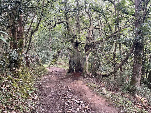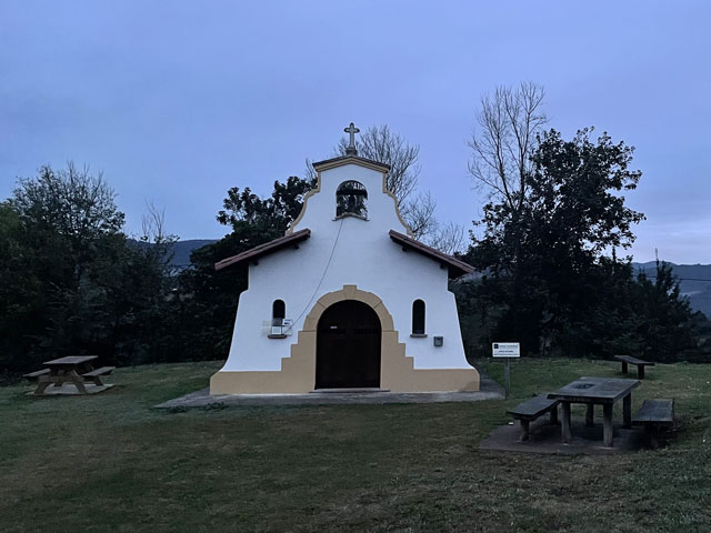 Nachdem ich schon eine Weile wach lag, bin ich um halb sieben aufgestanden, habe meine Sachen gepackt, das Bett abgezogen und mich in die Küche geschlichen, um mein spärliches Morgenmahl einzunehmen. Ein oder zwei waren schon weg, die kleine Südafrikanerin war noch mit Körperpflege und Rucksackpacken beschäftigt und ein junger Spanier kam kurz nach mir. Als ich um viertel acht losgegangen bin, war es draußen noch dunkel, aber das erste Stück des Weges führte über die gemeinsame Dorfstraße aufeinander folgender Dörfer, die mit Laternen versehen ist. Es wurde dann aber schnell hell, obwohl man der Einfachheit halber den Sonnenaufgang hat ausfallen lassen. Die Hügel, zwischen denen der Weg hindurch führte, waren entweder in Nebel gehüllt oder von Wölkchen umgeben.