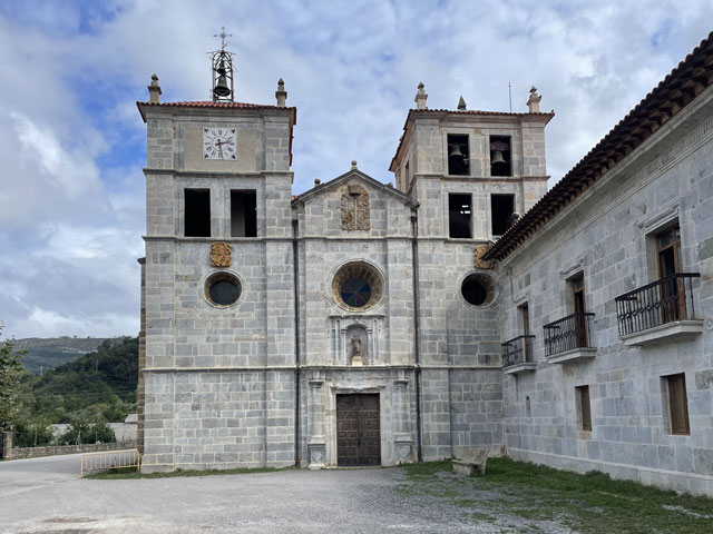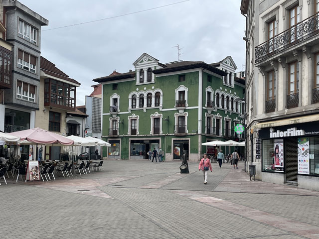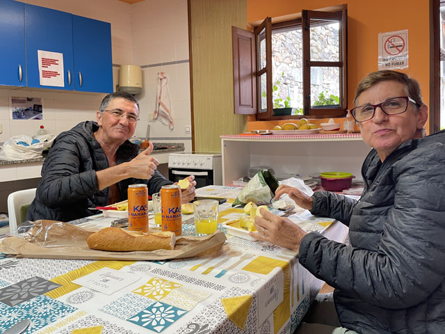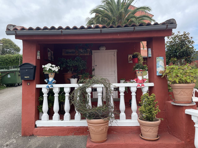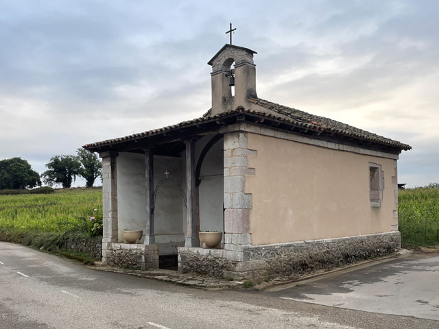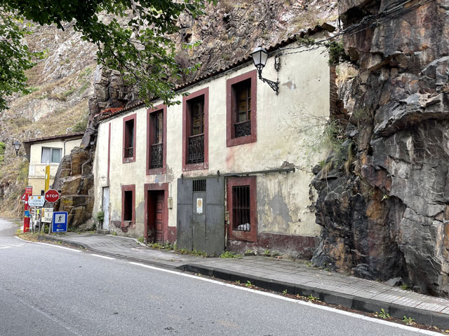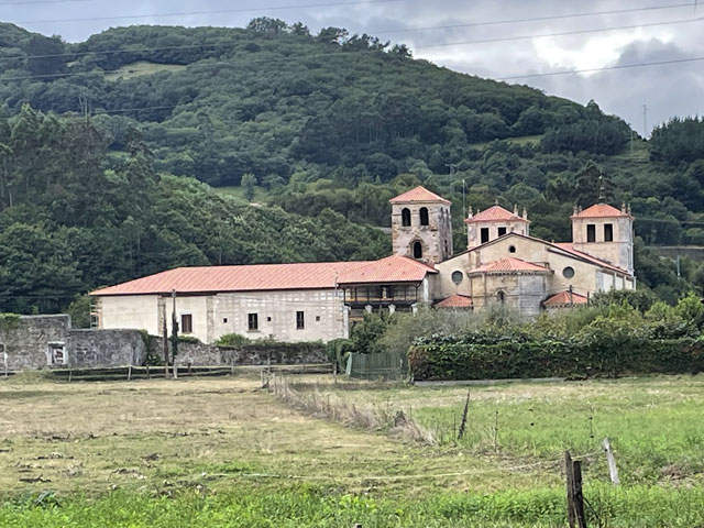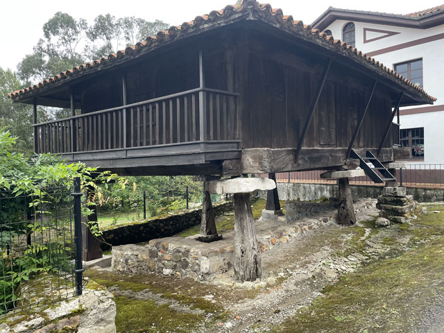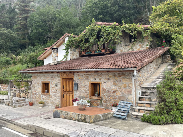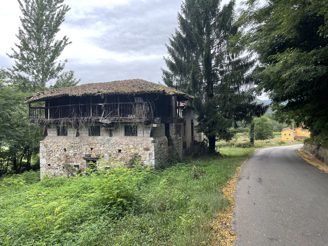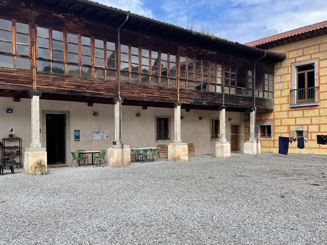 Eine hübsche kleine, leider verschlossene Kapelle am Straßenrand, die „Ermita de la Virgen de Fátima“, bot gute Gelegenheit für eine rechte Einstimmung in den Tag. Der Weg führte dann bald von der Straße weg und schlängelte sich durch die Gehöfte. Hier musste ich mich mal eines kleinen kläffenden Hundes erwehren, der sich zwar nicht traute zu beißen, mich aber auch nicht vorbei lassen wollte. Das war aber auch sein gutes Recht, denn ich hatte einen Abzweig übersehen und stand kurz vor dem von ihm zu bewachenden Gehöft. Der zwecks Hundezähmung heraustretende Bauer hat mir dann freundlicherweise den verpassten Abzweig gezeigt. Den dort aufgestellten Pfeil hatte ich zwar wahr-, aber nicht ernstgenommen, da er nicht klassisch gelb war. Während dieser Abschweifung hat mich der junge Spanier überholt, der mit seiner Stirnlampe den inzwischen im Hellen liegenden Weg ausgeleuchtet hat. Bald darauf kam eiligen Schrittes auch die kleine Südafrikanerin, die aber kurz nach dem Überholen jäh stoppte, weil es eine Katze zu streicheln gab. Letztere hat sich gedreht und gewunden, damit auch ja keine Körperstelle beim Streicheln ausgelassen wird. Das Mädel hat wohl auch die nachfolgend am Weg stehenden Katzen ähnlich verwöhnt, denn jetzt, nach fast drei Stunden, hat sie mich noch nicht wieder eingeholt. Von den anderen habe ich auch noch niemand zu sehen bekommen. Entweder haben die so lange geschlafen oder sie sind zum Frühstück in die Gaststätte eingekehrt, in der wir uns am Abend angemeldet hatten. Jetzt, 10.30 Uhr, bin ich gleich in Grado, wo ich hoffentlich einen Café von Leche bekomme. Schon 50 Meter vor dem Ortseingang von Grado bot sich die Möglichkeit, dem Körper einen Kaffee zuzuführen. Damit er dort nicht so allein ist, habe ich noch eine große Schrippe mit einem Schnitzel drin nachgeschoben. Ohne Beilage wollte die Schrippe nicht so richtig rutschen, aber dabei half dann ein Getränk mit schwarz-rotem Etikett. So konnte ich gut gelaunt die Stadt betreten, die ein paar nette Häuser und eine sehenswerte Kirche zu bieten hat. Da es hinter der Stadt bergauf geht und nicht abzusehen war, wann ich wo landen werde, habe ich mich noch in einem Supermarkt für unterwegs und vorsichtshalber auch fürs Abendbrot eingedeckt. Der Aufstieg war letztlich nicht so schlimm wie erwartet, was mich aber nicht davon abgehalten hat, unterwegs reichlich Pause zu machen. Ein von meinem Namensvetter Benedikt Kurz in San Sebastián (auf Euskara, d. h. auf Baskisch „Donostia“ genannt) kreiertes „Keler“-Bier, das mir schon auf dem Camino del Norte viel Freude bereitet hat, half dabei, mich bei Laune zu halten. Aber eigentlich ist man bei jedem Aufstieg mit den schönen Ausblicken ins Land belohnt worden. Es gab zwar selten mal was Spektakuläres, aber immer was Schönes zu sehen. So wie ich es liebe: hübsche kleine Dörfer und dann wieder fast verlassene, in denen die Bäume aus den Dächern wachsen. Auch das hat seinen Charme. Eine kleine, schon halb eingestürzte Wassermühle kurz vor meinem Tagesziel habe ich zum Beispiel auf YouTube in allen Camino-Primitivo-Videos gesehen. Sowas scheint doch jeden zu faszinieren. Als Tagesziel hatte ich mir heute Cornellana ausgesucht - ca. 26 km von meiner letzten Herberge in Escamplero entfernt. Ich habe befürchtet, wer-weiß-wie-lange dafür zu brauchen, aber irgendwie war ich ganz gut in Form und schon vor vier Uhr am Ziel. Da stellte sich aber die schwierige Frage, in welcher der beiden Herbergen ich nächtigen soll: kurz vor dem Ort in der privaten Herberge „Roca Madre“ oder im Ort in der kommunalen Herberge am Kloster. Erstere, die auf Spendenbasis betrieben wird, wirbt mit einer traditionellen Pilgeraufnahme, d. h. mit gemeinsamen Abendbrot und Frühstück, die andere lockt mit dem angrenzenden Kloster und einer eventuellen Kirchenbesichtigung. Diese 8 €-Herberge zählt in der „Buen Camino“-App zu den am besten bewerteten am Weg. Da fällt einem die Entscheidung nicht leicht. Weil beide dicht am Weg liegen, habe ich mir zunächst die „Roca Madre“ angeschaut, für die ein großes Plakat an einem Hórreo wirbt. Unter diesem Hórreo ist ein recht gemütlicher Aufenthaltsraum im Freien, von dem man in einen sehr ordentlichen Schlafsaal mit fünf Doppelstockbetten kommt. Gleich daneben ist ein altes, aber schön hergerichtetes, flaches Haus in dem sich die Küche und vermutlich der Essenraum befinden. Als ich kam, war gerade der erste Gast dabei, sich einzurichten. Ein Deutscher, wie sich nach einer in Englisch abgehaltenen Konversation zeigte. Der wusste zu erzählen, dass mindestens noch zwei andere dort Quartier nehmen wollen. Wenn‘s dabei bliebe, wäre das eine nur sehr kleine, gemütliche Runde. Da ich noch einkaufen wollte und keine rechte Lust hatte, dafür einen Kilometer ins Dorf und wieder zurück zu laufen, habe ich mich für die „Klosterherberge“ im Dorf entschieden, von der es nicht weit zum Supermarkt ist. Ob das die bessere Entscheidung war, weiß ich nicht, aber es war eine gute Entscheidung. Diese Herberge mit 30 Betten in drei oder vier Räumen ist ganz ordentlich und hat eine gut ausgestattete Küche mit einem langen Esstisch zu bieten. Auf dem Innenhof stehen mehrere Tische mit Stühlen, teils unter dem vorgezogenen Obergeschoss, so dass man auch bei Regen draußen sitzen kann. Es gibt Waschmaschine und Trockner und im Hof jede Menge Wäscheleinen und Klammern. Eine Feldsteinmauer mit einem historischen Torbogen lässt trotzdem das Gefühl aufkommen, in einem Klosterhof zu sein. Hier kann man es gut aushalten. Gleich nach der Ankunft habe ich mit dem Mitgebrachten, einer 400 g-Salatpackung und einem Glas Paprika, die erste Abendbrot-Session abgehalten. Mit am Tisch saß das ältere der beiden spanischen Paare, die mit in der vorherigen Herberge waren: Andrés und Elena aus Madrid. Für ihn ist es der 15. Camino, für sie der zehnte. Vor vier Wochen sind sie in den Pyrenäen am Somport-Pass auf d