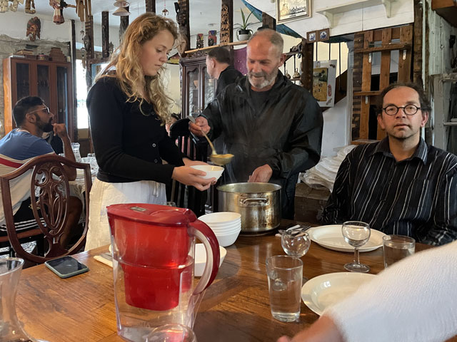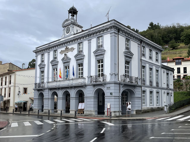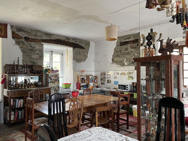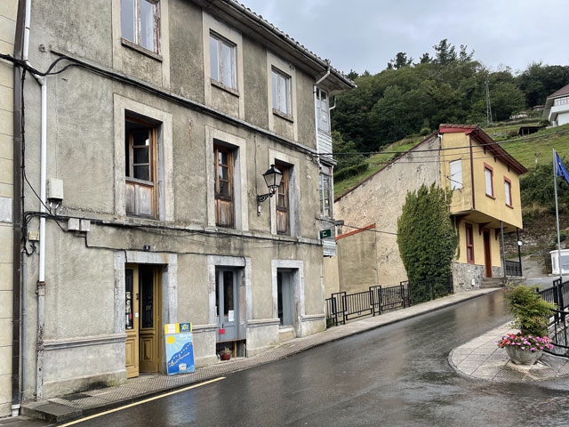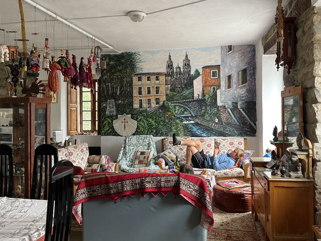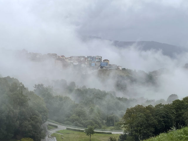 Kaum hatte ich heute Morgen den im Dunkeln getippten Bericht und die Fotos weggeschickt, ging plötzlich das Licht an. Ob die Stromsperre gewollt oder ungewollt war, habe ich nicht herausbekommen. Wie befürchtet erwiesen sich die Sanitäranlagen als etwas knapp bemessen. Aber da es heutzutage nicht vom äußeren Erscheinungsbild, sondern vom eigenen Gefühl abhängt, ob man Männlein oder Weiblein ist, habe ich mich heute mal so gefühlt, als ob die Damentoilette für mich die richtige wäre. Für diese gab es erfreulicherweise gerade keine Anwärterinnen, während vor der Herrentoilette Gedränge war. Mit mir ist nämlich eine fünfköpfige Gruppe junger Männer im Abiturientenalter aufgestanden und zeitgleich in Richtung Klo geeilt - bis auf einen, der schon dabei war, alle mit Blasen verzierten Zehen mit Pflastern zu umwickeln. Für die Damentoilette sprach auch, dass im Männerklo offenbar nachts einige versucht haben, in absoluter Finsternis stehend die Porzellanschüssel zu treffen. Als ich um halb acht losgezogen bin, war es noch ziemlich dunkel, weil alles in Nebel oder Wolken gehüllt war und es zudem bereits regnete. Erst als ich schon ein ganzes Stück den Berg hochgelaufen war, bildeten sich ein paar Wolkenlücken und gaben den Blick frei auf einzelne Teile der Stadt. Das war ein ganz imposantes Schauspiel. Bei einem der Ausblicke bin ich auf „Mexi“ (Margret, die mal ein Junge namens „Max“ werden sollte) gestoßen - eine pensionierte schweizerische Informatikerin, die seit ein paar Jahren verwitwet ist und nun allein diverse Jakobswege absolviert. Mit der bin ich eine ganze Weile schwatzend gelaufen. Vom Schweizerdeutsch habe ich zwar auch nicht alles verstanden, aber mehr als bei den Amerikanern, von denen hier einige unterwegs sind. Die Ärmste ist unfreiwillig mit einem kleinen Beutelchen auf dem Rücken unterwegs. Sie ist vorgestern auf dem Weg von einer Hornisse gestochen worden und mit tiefroter und dick angeschwollener Schulter- und Brustpartie in Salas zum Arzt gegangen, der ihr Cortison in allen Darreichungsformen verordnet und das Rucksacktragen für mindestens fünf Tage verboten hat. Nun muss sie immer ihr Gepäck zur nächsten Herberge transportieren lassen (was hier wie auf den anderen Wegen für je 5 € möglich ist) und die Unterkünfte vorbuchen, da man ja einen Zielort des Gepäcks angeben muss. Darüber ist sie gar nicht glücklich, da sie genau wie ich lieber läuft, bis sich Müdigkeit einstellt, statt sich vorher festzulegen. Bei einem der Aufstiege musste ich sie laufen lassen, weil mir sehr nach einer Pause war, während sie noch munter vorwärts stapfte. Na, vielleicht sehen wir uns nochmal. Die hübsche junge Südafrikanerin habe ich gestern Abend nahe der Rochus-Kapelle auch wiedergetroffen und endlich mal nach ihrem Namen gefragt: Zoe. Ich dachte, sie wohnt vielleicht in Europa, aber nein, sie ist extra wegen dem Jakobsweg nach Europa gekommen. Damit es sich lohnt, hat sie im französischen Le Puy begonnen, ist von Saint-Jean-Pied-de-Port entlang der Pyrenäen nach Irun gelaufen und hat dann den Camino del Norte bis Oviedo genommen. Bis hier waren das 79 Tage und 1.500 km. Als ich ihr sagte, dass sie sich beeilen soll, weil die Herberge schon ziemlich voll ist, meinte sie, dass dies kein Problem sei, weil sie ja ein Zelt dabei hat. Und tatsächlich schleppt sie scheinbar mühelos einen riesigen Rucksack durch die Gegend. Alle Achtung! Heute stand nach etwa 15 km die Entscheidung an, ob man den Weg über Hospitales oder über Pola de Allande nimmt. Ersterer geht ab da bergauf und verläuft dann auf etwa gleicher Höhe, vorbei an den Ruinen alter Herbergen (Hospitales). Der andere bleibt auf ursprünglicher Höhe und geht sogar bergab, um dann steil nach oben zu dem Punkt zu führen, wo sich beide Wege in der Nähe eines Passes treffen. Von den Höhenmetern nehmen sich also beide Wege nicht viel. Letzterer ist zwar ein Stück länger, bietet aber zwischendurch Unterbringungsmöglichkeiten, während der andere auf 20 km keine Herbergen hat. Wenn man den Weg über Hospitales gehen will, sollte man schon in Borres, kurz vor der Gabelung des Weges, Quartier nehmen. Da beim aktuellen Wetter ohne Fernsicht nichts für den Höhenweg sprach, blieb eigentlich nur der Weg über Pola de Allande. Der Ort bot sich auch gleich als Etappenziel an, da er knapp 30 km von Tineo entfernt ist und mehrere Herbergen hat. Anders als „vorgeschrieben“ bin ich die letzten Kilometer wieder auf der Straße gelaufen, weil die Wege durch den Regen ziemlich aufgeweicht bzw. rutschig waren und es zuletzt doch recht steil bergab ging. Ich habe zwar nichts gegen schlüpfrige Witze, aber schlüpfrige Wege sind nicht mein Ding. Darum bin ich lieber zwei, drei Kilometer mehr auf der in weiten Bögen langsam bergab führenden Straße gelaufen, als auf den steilen, rutschigen Wegen durch den Wald. Um vier war ich in Pola de Allande und habe mich da gleich zur Herberge „Donativo Polagrino“ begeben, was sich als ein Glückstreffer herausstellte. Es ist ein ziemlich herunter gekommenes Haus, das wie ein Museum mit altem Kram vollgestellt ist und nicht viel Luxus, aber eine einladende Atmosphäre bietet. Ein Holländer, der heute den ganzen Nachmittag im Overall und mit Rohrzange rumgerannt ist, hat das Haus kurz vor Corona gekauft und richtet es jetzt nach und nach her. Es finden sich offenbar auch immer wieder ganz leicht Freiwillige, die hier helfen. Gerade habe ich eine Weile mit Wolfgang aus Nürnberg, geschätzt Mitte 50, geschwatzt, der zum wiederholten Male für ein paar Tage hier ist, um zu helfen. Ein älterer Spanier hat uns zum Abendrot bekocht und für den sonstigen Herbergsbetrieb sind gerade zwei junge Schwedinnen und eine Australierin für zwei Wochen hier - freiwillig, ohne Bezahlung, für freie Kost und Logis. Denen allen macht es Spaß, auf diese Weise viele neue Menschen kennenzulernen und die Sprachkenntnisse zu erweitern. Das Verhältnis zur Gästezahl 
