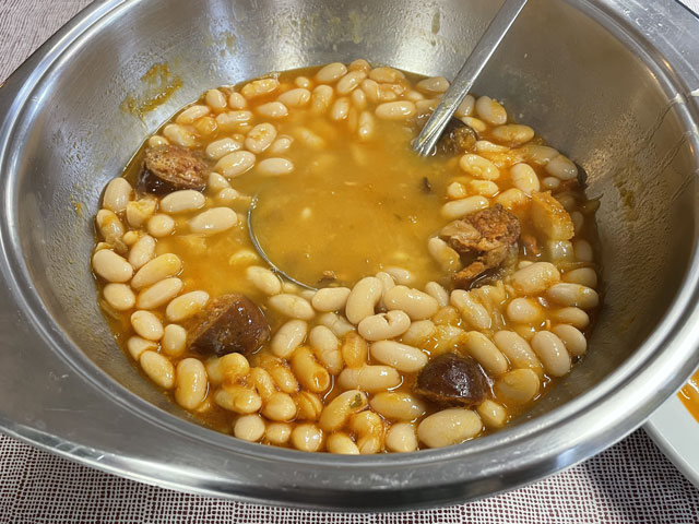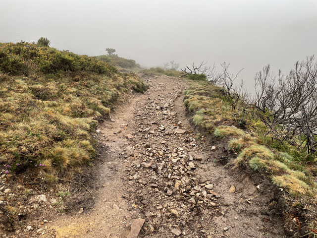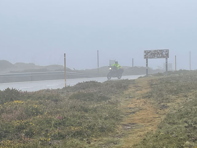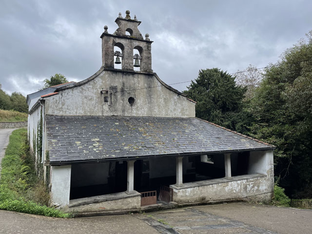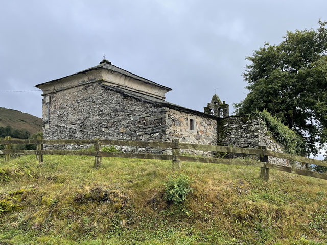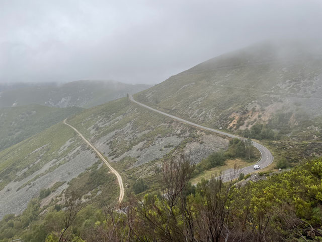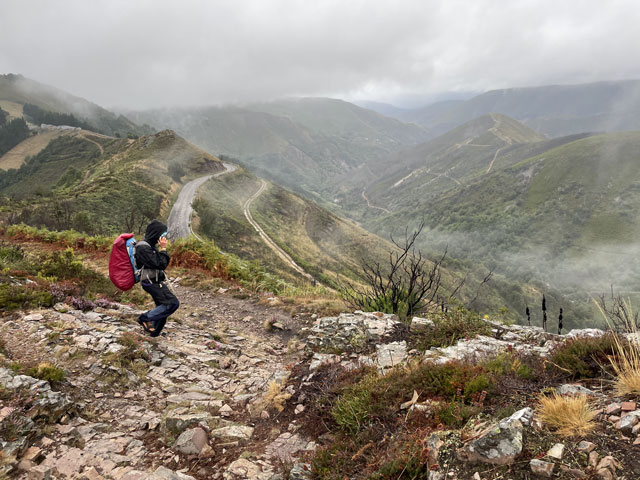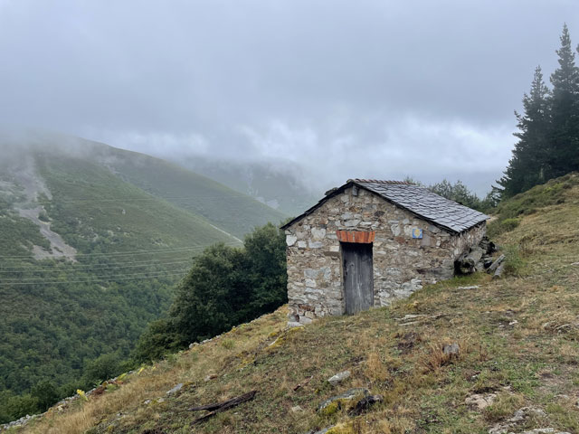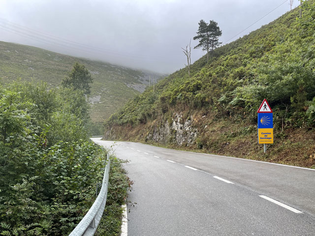 Also, der allein reisende Herr mit dem Wecker ist auch gleich rausgesprungen, hat seinen Kram zusammengepackt und ist verschwunden. Eine halbe Stunde später, also um sechs, hat das Pärchen nach besagter Kletterpartie mit dem Einpacken begonnen und dabei unter Beweis gestellt, wie weit man mit einer Smartphone-Lampe leuchten kann und dass man bei geschickter Drehbewegung einen ganzen Schlafraum ausleuchten kann. Als die dann zum Frühstück aufgebrochen sind, habe ich mich aus den Federn gequält. Als Letzter konnte ich nun auch die richtige Zimmerbeleuchtung einschalten, die viel angenehmer war, als die Smartphone-Strahler. Zum Frühstück war im Erdgeschoss, wo wir schon am Abend zusammen Bohneneintopf und Tortilla gegessen haben, alles fürs Frühstück aufgebaut: Brot, Margarine, Marmelade, Cornflakes, Müsli, Milch und natürlich Kaffee. Ich konnte das Sortiment noch um zwei am Abend zuvor gekaufte Wurstpäckchen ergänzen, wofür sich aber zum Glück außer mir kein Interessent fand. Nach Hinterlegung einer angemessenen Spende für Unterkunft und Verpflegung habe ich mich um halb acht, als es langsam hell wurde, auf den Weg gemacht. Ab dem Ortsausgang ging es bergauf, woran sich die nächsten vier Stunden nichts ändern sollte. Der ausgeschilderte Weg führte bald links weg von der Straße. Ich bin ganz brav den Schildern gefolgt, aber nachdem es auf den ersten zweihundert Metern wiederholt hoch und runter ging, bin ich bei der nächsten Gelegenheit wieder auf die Straße, zumal es zu regnen anfing und die Geröllpiste rutschig wurde. Ich bin dann auch bis zum Pass auf der Straße geblieben, was zwar sicher doppelt so lang, aber nur halb so steil war. Viel Verkehr war ja nicht und auf der Straße gab es nicht die Gefahr, ins Rutschen zu kommen oder im Schlamm steckenzubleiben. Auf der Straße, aber auch auf dem erst moderat, zum Schluss jedoch sehr steil ansteigenden Weg steckte man heute schon lange vor Erreichen des Passes in den Wolken. Es war recht kalt, der Regen peitschte und es blies ein kräftiger, eiskalter Wind. Alles zusammen ergab eine Temperatur, die gefühlt deutlich unter den angezeigten 10 Grad lag. Irgendwann war dann gar nichts mehr zu sehen. Auf dem Pass „Puerte de Pola“ mit seinen 1146 Metern steckte man mitten in den Wolken und außer Regen und Kälte war da nichts. Für den Abstieg habe ich den offiziellen Weg gewählt, der zwar schwer zu laufen, aber deutlich kürzer als die Straße ist, die in weiten Bögen ins Tal führt. Das Abwärtslaufen auf dem nassen Geröll ging tatsächlich ganz schön auf die Fußgelenke. Nachdem zwei Straßenkehren abgeschnitten waren, lag plötzlich ein winziges, verlassenes, aber noch nicht verfallenes Dorf vor mir. Der Weg führte vorbei an den zwei neuzeitlichen Häusern und einigen Ställen sowie anderen Wirtschaftsgebäuden, die wie die Einfriedungen aus Felsbrocken bestehen, welche hier in großen Feldern an den Berghängen liegen und die Wege so schwer passierbar machen. Das Ganze sah ziemlich gespenstisch aus. Leider gab es da nirgendwo die Gelegenheit, sich mal hinzusetzen. Nur kalte Steine und Wind und Regen von allen Seiten. Hier habe ich es leider versäumt, wieder auf die Straße zu wechseln, die fortan in nicht so großen Kurven ins Tal führt. Der Camino verläuft hingegen unsinnigerweise noch ein ganzes Stück aufwärts und knapp an der nächsten Bergkuppe vorbei. Runter geht es dann ziemlich steil auf felsigem Grund, bis die Straße erreicht ist, die man hätte nehmen können, ohne solche Strapazen zu erleiden. Hier stand doch tatsächlich mal ein Haltestellenhäuschen und ich konnte etwas vor Wind und Regen geschützt nach fünf Stunden Wandern endlich eine Pause machen und mein eigentlich für den Pass vorgesehenes Glückwunsch-Getränk zu mir nehmen. Wie ich da so sitze, kommt ein Taxi, vollgepackt mit Pilgern vorbei. Die Dame auf dem Beifahrersitz hat ein so markantes Gesicht, dass ich sie sofort erkannt habe: Jennifer, eine Französin, die furchtbar nerven kann. Die war in Tineo in der Herberge und hat jeden vollgelabert, auch wenn er deutlich zu erkennen gegeben hat, dass er gerade lesen, schreiben oder telefonieren wollte. Mit dem Taxi kommt man gut voran! Ab besagter Haltestelle habe ich wieder abwechselnd den „richtigen“ Weg oder die daneben verlaufende Straße benutzt. Letzteres, damit sich die inzwischen arg strapazierten Fußgelenke etwas erholen können. Mein Tagesziel war Berducedo, das erste mit Herbergen versehene Dorf hinter dem Pass. Es hatte sich zwar schon rumgesprochen, dass da alles voll ist, aber die Hoffnung stirbt zuletzt. Eigentlich steht bei einigen Herbergen, dass man nicht reservieren kann. Da wundert es einen, dass die schon am Tag zuvor als „voll“ gemeldet werden. Früher konnte man wohl wirklich nicht in den kommunalen Herbergen ein Bett reservieren. Das ist erst seit Corona erlaubt und nicht wieder abgeschafft worden. Ich habe in Berducedo gleich die erste Herberge angesteuert, die kommunale Herberge mit 24 Betten. Da war es halb drei und an der Tür hing wirklich ein Zettel „voll“ und drinnen waren tatsächlich schon viele Pilger am Rumwuseln. Ob wirklich alle Betten belegt, oder manche nur reserviert waren, weiß ich nicht. Ein Hospitalero, den man hätte fragen können, war nicht zu finden. Da kam ein spanisches Mädel, das mich hinter dem Pass überholt hatte, auf mich zu und hat mir ihr Zelt angeboten, da sie noch einen Platz in der Herberge ergattert hat. Das fand ich furchtbar nett, aber da ich mich für solchen Campingurlaub schon etwas alt fühle, habe ich dankend abgelehnt und ihr gesagt, dass ich es im nächsten Ort probieren will. Sie war sehr skeptisch, dass ich da was bekomme, weil es dort nur eine relativ kleine Herberge gibt. Ich solle unbedingt vorher anrufen und vielleicht doch lieber das Zelt nehmen. Ich habe wirklich gleich in der Herberge von La Mesa angerufen und sogar die Chefin erreicht, aber sie konnte mich offenbar nicht hören, während i