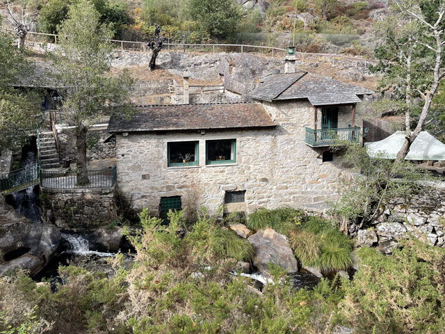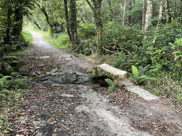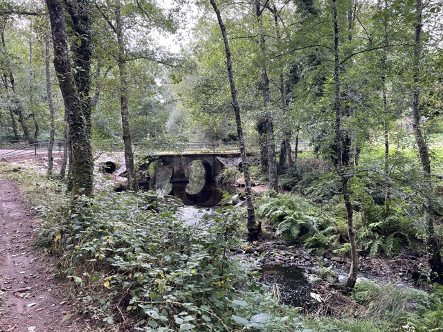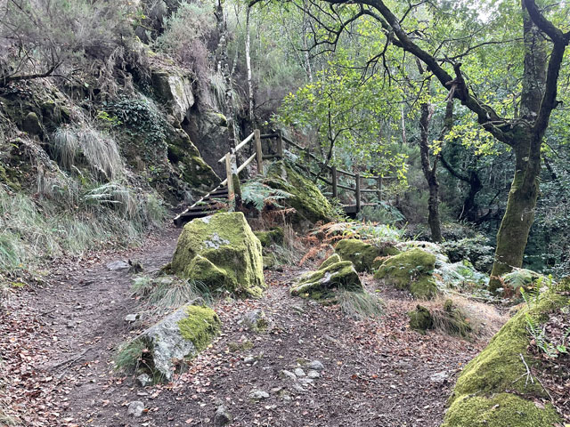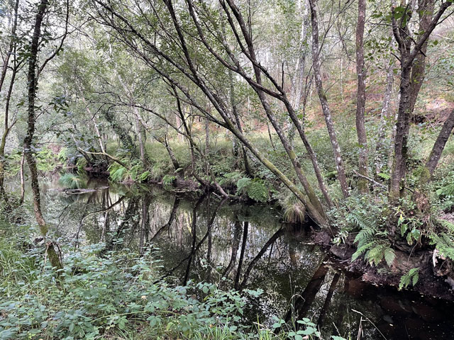 Ich war zwar wirklich am frühen Nachmittag in Lugo, aber durch die vorstehend aufgeführten Aktivitäten war es inzwischen fast fünf. Ich habe mich trotzdem auf den Weg gemacht und bin auf dem in der Karte als CPN (Camino Primitivo/Norte) eingezeichneten, aber in der Natur nicht markierten Weg runter zum Flüsschen und diesem dann stromaufwärts auf Trampelpfaden und Holzstegen bzw. -treppen durch eine Art Kirnitzschtal gefolgt. Felsen gab es hier zwar nur wenige, dafür aber einen „Lichtenhainer Wasserfall“, der auch ohne Strippe-Ziehen funktioniert. Es war durch die vielen Stromschnellen und Inselchen im beidseits von dichtem Farn gesäumten Bach einfach großartig. Und kaum jemand war auf dem gut ausgebauten Weg unterwegs. Nur ein Paar mit Hunden habe ich auf den 3…4 Kilometern entlang des Baches getroffen. Nach einer Stunde bin ich auf einer kreuzenden Straße raus aus dem Tal und auf einer Fernstraße zu einem parallel verlaufenden Weg, der mich wieder nach Lugo bringen sollte.