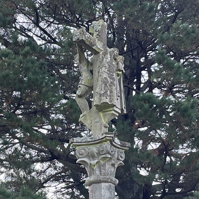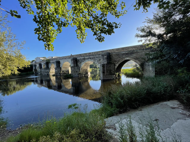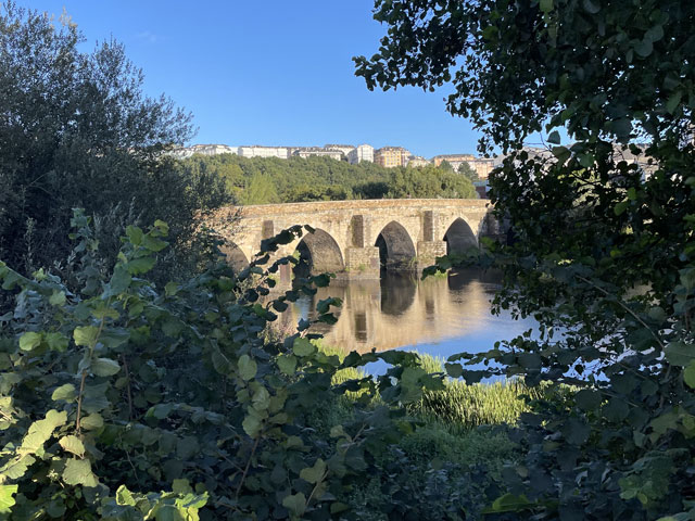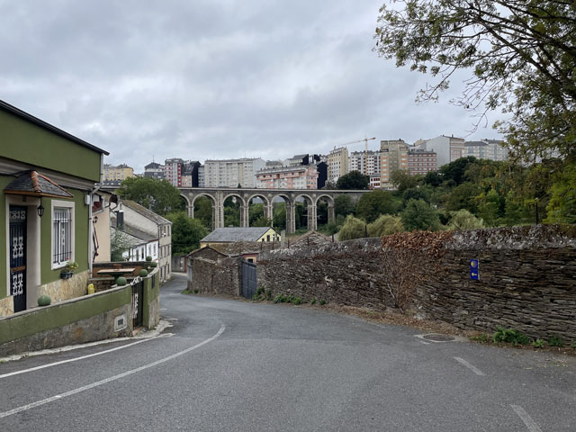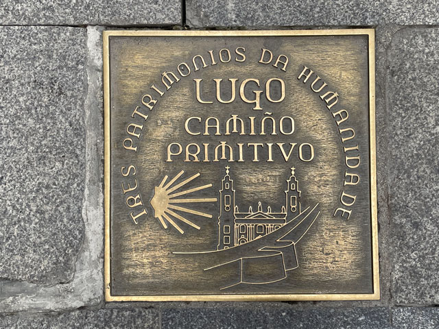 Dieser, leider entlang einer stark befahrenen Straße führende Weg ist die „Via Romana XIX“, also die römische B 19. Die ist vor 2000 Jahren angelegt worden, um Galicien zu erschließen. Sie verbindet die etwa zeitgleich von den Römern gegründeten Städte Braga (im Norden Portugals), Lugo (Galicien) und Astorga (Asturien). Sie ist etwa 450 km lang und vielerorts mit goldenen Plaketten, alten Meilensteinen oder neuzeitlichen Markierungssteinen versehen. Auf früheren Caminos bin ich wiederholt darauf gestoßen. Hier fand sich nun außer dem Eintrag in der Karte gar nichts als Hinweis. Erst an der „Punta Romana“, der alten Römerbrücke, die über den Rio Niño nach Lugo hineinführt, fand sich ein mit „Via Romana XIX“ beschrifteter Markierungsstein sowie eine Erklärung zur Brücke und zur darüber hinweg führenden Straße, ergänzt durch einen lebensgroßen, in Blech gekleideten Römer. Eine goldene Plakette mit dem Namen und Verlauf der Straße habe ich erst nahe der Kathedrale gefunden.