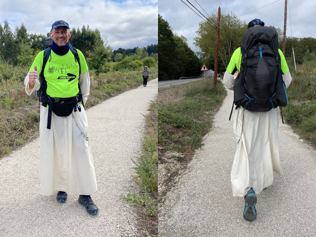 Unter den wenigen, die heute an mir vorbeigezogen sind, war auch wieder der Mann im weißen Gewand, über das er nicht wie bisher einen dicken Anorak, sondern ein Camino-T-Shirt gezogen hatte. Heute habe ich ihn angesprochen. Es ist wirklich ein Priester, David aus Polen. Er läuft wie ich von Oviedo nach Santiago, nur deutlich schneller. Drum blieb es bei diesem kurzen Wortwechsel und einem Foto. Länger konnte ich bei seinem Schritt nicht mithalten. Ein wenig geplaudert habe ich auch mit einem schwedischen Rentner, der mit seiner spanischen Freundin unterwegs ist. Er ist mit 61 in Rente gegangen, normal ist in Schweden 65. Inzwischen hat er auch schon fünf Caminos hinter sich.