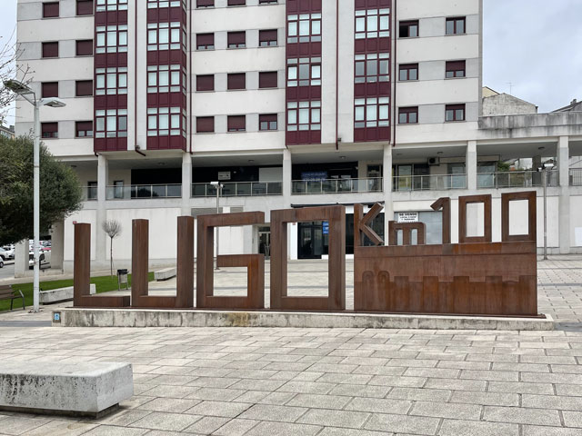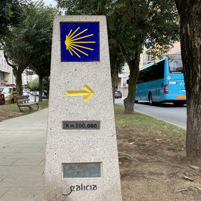 Da die Beiden noch vor Lugo Rast machen wollten, bin ich allein weitergezogen. An einem Autobahnkreuz macht der Camino noch mal einen großen Bogen und taucht dann in einen Vorort von Lugo ein. Gespannt habe ich die Entfernungsangaben auf den Markierungssteinen verfolgt, die immer niedriger wurden und sich der Hundert näherten. Wird es einen Stein mit glatt 100 km geben und wo wird der stehen? Da, wo die „Dorfstraße“ des nicht sonderlich attraktiven Vorortes auf die breite, stark befahrene Rua de San Eufrasio trifft, steht gegenüber mit mannshohen Buchstaben „Lugo 100 km“. Wenn man da nicht gleich vorbei läuft, sondern sich noch umsieht, dann findet man auf dem Mittelstreifen an einem Übergang den üblichen Markierungsstein mit exakt „100,000 km“.