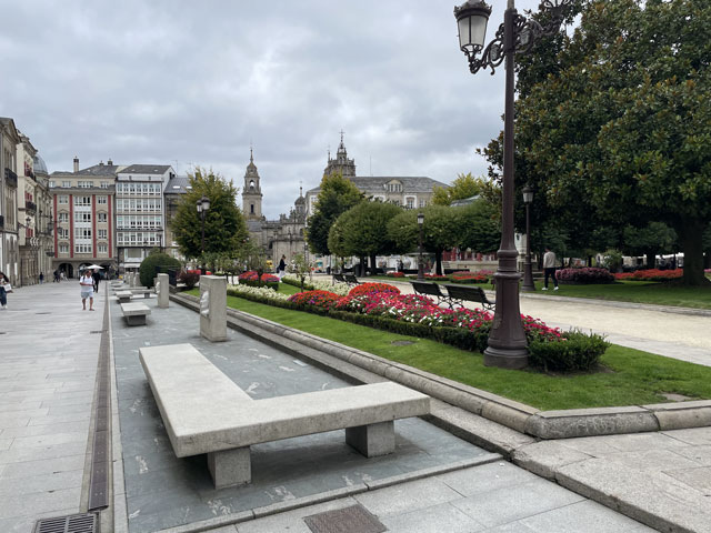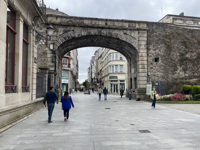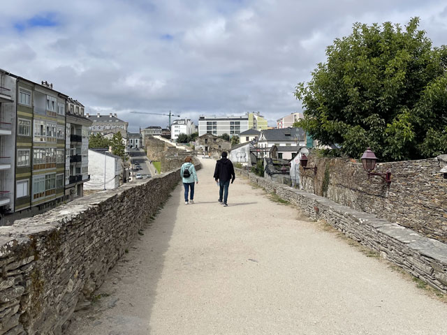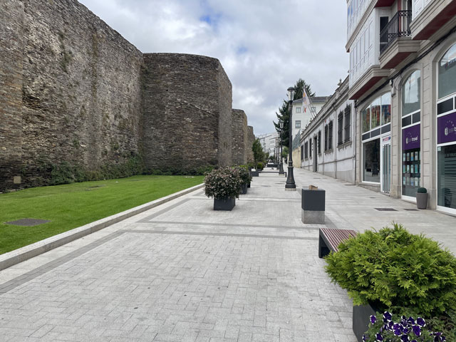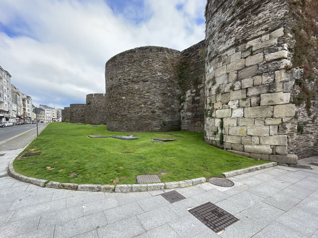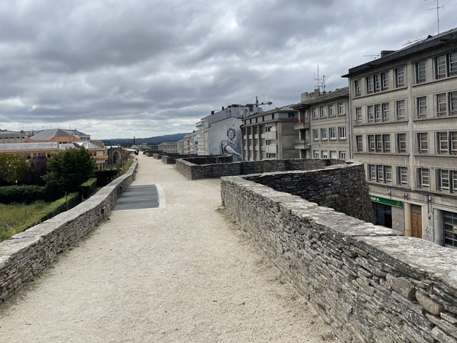 Ich bin neben dem Tor die Rampe hoch auf die 6…8 Meter dicke und bis zu 12 Meter hohe Stadtmauer, die durchgängig begehbar ist. Einschließlich der 86 halbrunden Vorbauten ist sie in einem tadellos wieder hergerichteten Zustand und es macht Spaß, darauf zu spazieren, auch wenn nicht jeder Blick in die Innenstadt bzw. in die umliegenden Wohnviertel wirklich was fürs Auge ist. Auch innerhalb der Stadtmauer gibt es viele Brachen und eingefallene Häuser. Die Wohnviertel rings um die Innenstadt bestehen überwiegend aus fünf- und mehrgeschossigen Häusern jüngeren Datums, die weit sichtbar sind, egal aus welcher Richtung man sich der auf einem Berg liegenden Stadt nähert. Durch die hohen Bauten nimmt aber Lugo, die Hauptstadt der gleichnamigen galicischen Provinz, mit fast 100.000 Einwohnern relativ wenig Raum ein.