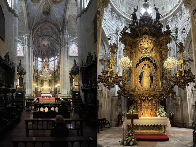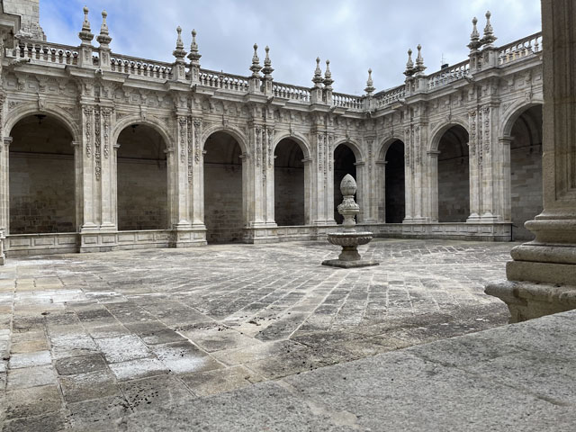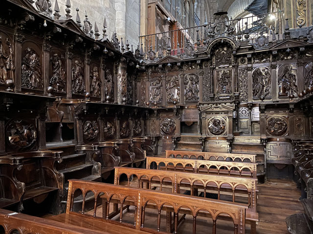 Ich habe in der Herberge nur meine Sachen abgestellt und bin dann nach einem kühlen Getränk zu einer Stadtbesichtigung aufgebrochen. Diese begann in der Kathedrale, wo man als Pilger Rabatt bekommt, wenn man denn seinen Pilgerpass dabei hat. Den hatte ich auch vorsorglich eingesteckt, weil ich ja auch einen Kathedralen-Stempel haben wollte. Nach dem, was ich hier schon an Kathedralen zu sehen bekommen habe, war diese etwas dürftig, mal abgesehen vom golden glänzenden Altarretabel und dem prächtigen Chorgestühl. Gegenüber dem Portal der Kathedrale führt der Weg durch ein Tor in der Stadtmauer, das über dem Torbogen in recht verwittertem Stein St. Jakobus als Maurentöter zeigt, was heute schon wegen der Wortwahl als anrüchig gilt. Während der Reconquista, also der Rückeroberung Spaniens aus den Händen der Araber, soll Jakobus in der entscheidenden Schlacht plötzlich mit dem Schwert in der Hand auf einem weißen Pferd erschienen sein und unter den Arabern ordentlich aufgeräumt haben.