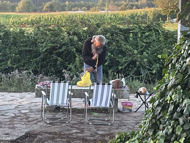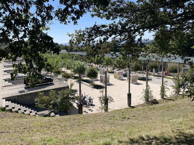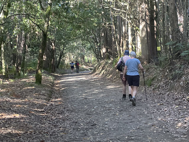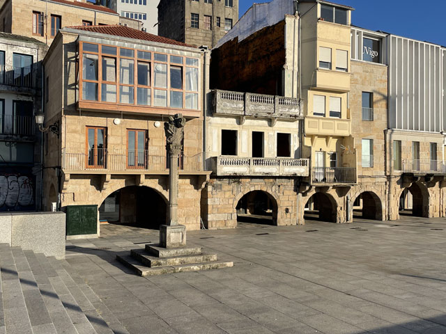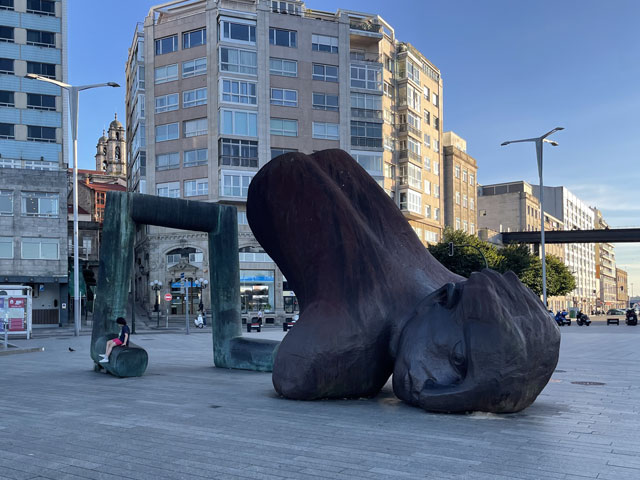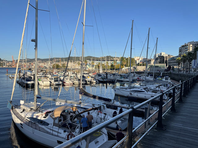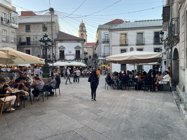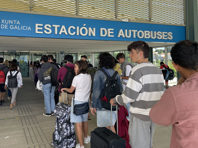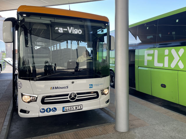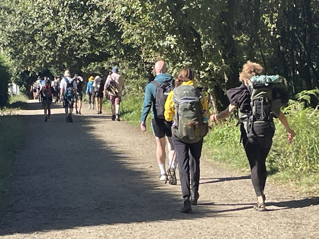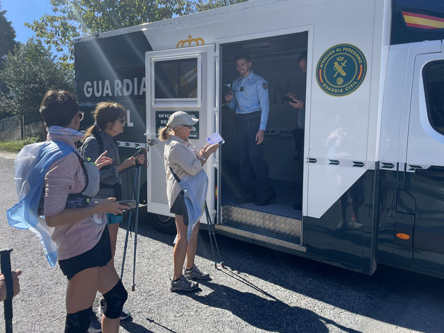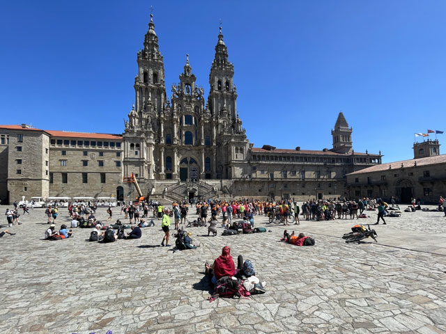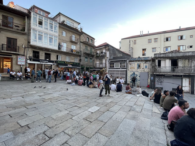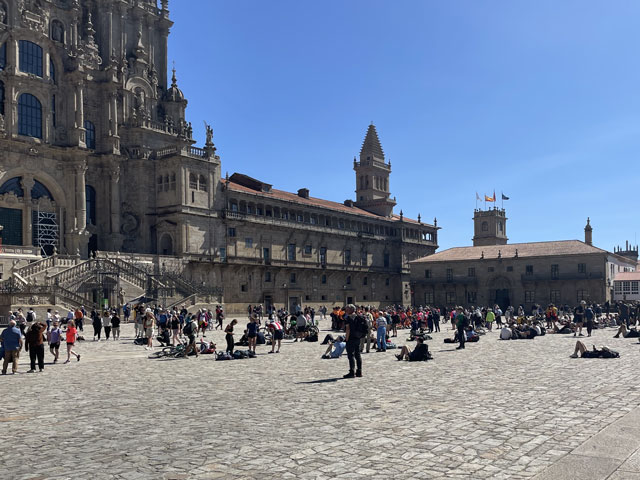 Bis es hell wurde, bin ich wieder auf der Straße geblieben, statt mit der Smartphone-Lampe Waldwege auszuleuchten. Die weißen Linien auf der Straße sieht man auch ohne Licht. Als es dann hell wurde und ich von der Straße auf den Camino gewechselt bin, musste ich sehen, wie viele schon unterwegs waren. Da müssen in Arzúa Heerscharen schon um fünf aufgebrochen sein. Obwohl ich einigermaßen zügig gelaufen bin, wurden es immer mehr um mich herum, mehrheitlich mit leichtem Gepäck versehen. Darunter jede Menge Amerikaner reiferen Alters. Die Kneipen am Wegesrand waren schnell so gefüllt, dass man am Tresen anstehen musste. Zum Glück hatte ich bereits an der Straße meinen morgendlichen Kaffee getrunken und noch was zu essen und zu trinken im Rucksack. Da musste ich mich nicht in die Warteschlangen einreihen. Je mehr Leute unterwegs waren, umso lauter wurde es und auf jedem Stückchen Grün um die Kapellen herum saßen Leute und haben Picknick gemacht. Auf dem Weg musste man laufend beiseite springen, weil ein Grüppchen Radfahrer kam - meist auf E-Mountainbikes und auf dem Rücken völlig verdreckt, weil solch ein Mountainbike natürlich kein Schutzblech haben darf. Unter den Radlern, die einem in der Regel ein freundliches „Buen Camino“ zurufen, waren wie vor zwei Jahren wieder viele Brasilianer, die immer eine Fahne am Rad mitführen. Das ergab insgesamt zwar eine ganz nette Volksfeststimmung, aber wenn man in Ruhe seinen Weg gehen will, dann geht einem das auf die Nerven. Ich habe mich schon bald nach der Ruhe der Landstraße gesehnt und bin, als der Flughafen umrundet war, bei der nächsten Gelegenheit wieder dorthin gewechselt. In San Marcos habe ich mich erneut auf den Weg begeben und bin dabei auf einen älteren, schon etwas zittrigen, aber ansonsten ganz kernigen Kanadier gestoßen, Pierre aus Ottawa. Der ist vor vier Monaten in Paris gestartet, hat ab Le Puy die Via Podiensis bis Saint-Jean-Pied-de-Port genommen, ist weiter bis Bayonne und praktisch um die Pyrenäen drum rum nach Pamplona. Von dort auf dem Camino Francés bis Leon, dann nach Oviedo und wie ich auf dem Camino Primitivo nach Santiago. Anschließend will er noch nach Fatima und da ich von meinen Plänen für die nächsten Tage erzählt habe, kam ihm die Idee, das auch noch zu machen. Jetzt wollte er aber erstmal in die Herberge auf dem Monte do Gozo. Irgendwie ist er aber mit seinem Kartenprogramm nicht klar gekommen und hat gemeint, anders laufen zu müssen, als ich ihm geraten habe. Damit er sich nicht auf den letzten Metern verirrt, habe ich ihn geschnappt und zu seiner Herberge gebracht. Er hat gelacht, als ich diese mit einem Kriegsgefangenenlager verglichen habe. Als er die Barackensiedlung zu sehen bekam, hat er mir aber zugestimmt. Zur Ehrenrettung der Herberge sei aber gesagt, dass es in den vielen barackenähnlichen Bauten sehr schöne Zimmer mit wenigen Betten und eine gute Infrastruktur gibt. Schockiert waren wir aber beide, als wir die fast hundert Meter lange Schlange an der Rezeption gesehen haben. Ich habe ihn da seinem Schicksal überlassen und bin weiter. An der nächsten Ecke stand ein mobiler Polizeiposten. Ein großer Van mit zwei Polizisten, die eifrig Pilgerpässe gestempelt und neben Ratschlägen auch Pflaster und ähnliches verteilt haben. Das ist eine nette und hilfreiche Geste der Guardia Civil, die sich wirklich um das Wohl und die Sicherheit der Pilger bemüht. Unlängst habe ich ja schon von der App „Alert Cops“ geschwärmt, mit der man im Bedarfsfall ganz leicht Kontakt aufnehmen und z. B. seine Position übermitteln kann. Ich habe hier nach über 35 Jahren erstmals wieder einen Stempel von der Polizei bekommen - und das freiwillig. Bald danach kommt man an das viel fotografierte Ortseingangsschild von Santiago, ab dem es aber noch 3…4 km, also eine dreiviertel Stunde bis zur Kathedrale ist. Da ich nicht wusste, wie lange das Prozedere im Pilgerbüro dauert, bin ich gleich dort hin und war erstaunt, wie schnell das ging. Da fast alle Schalter besetzt waren, habe ich vielleicht fünf Minuten gewartet, obwohl über 40 Mann vor mir waren. Ich hatte die Nummer 1071 - nachmittags halb drei, wo ein großer Schwung noch kommt. Gestern sind insgesamt ca. 2500 Pilger angekommen. Danach bin ich dann zum Platz vor der Kathedrale, der gut gefüllt war und wo die am lautesten gejubelt haben, welche die kürzest mögliche Strecke mit kleinem Gepäck absolviert haben. Die sind in der Regel leicht an den einheitlichen T-Shirts zu erkennen. Gefreut habe ich mich, dass ich hier das Ehepaar aus Madrid wiedergetroffen habe. Leider hat Andrés irgendwas mit Magen/Darm erwischt. Er hat in Melide zwei Tage flach gelegen und sie mussten für das letzte Stück den Bus nehmen, da morgen der Flieger nach Hause geht. Das tut mir wirklich leid und macht mich zugleich glücklich und dankbar, dass mir bisher solches oder anderes Leid erspart geblieben ist. Im Pilgerbüro konnte ich dann endlich in Erfahrung bringen, wie die Kilometerzählung auf der sogenannten „spirituellen Variante“ des Camino Portugues ist. Also, das ist kein eigenständiger Weg. Ob man von Pontevedra nach Padron geradeaus läuft, oder den großen Bogen über die Halbinsel schlägt, ist jedem selbst überlassen und wird bei der Kilometerzählung nicht berücksichtigt. Ausschlaggebend dafür, ob man eine Compostela bekommt, ist nur die Entfernung des Startpunktes. Und erfreulicherweise ist Vigo, das ich als Ausgangspunkt ins Auge gefasst hatte, lt. Pilgerbüro 100,1 km weg von Santiago! Der Routenplaner hatte da immer weniger ausgewiesen, aber der nimmt ja auch den kürzesten Weg. Also auf nach Vigo, von wo ich auf einem noch nicht begangenen Weg nach Pontevedra laufen will und dann auf der genannten Variante nach Padron, von wo es wieder direkt nach Santiago geht. Gleich neben dem Pilgerbüro ist ein Fahrkartenschalter des Busunternehmens „Monbus“, wo ich die Fahrkarte (7,75€) kaufen wollte, aber der Schalter war nicht 