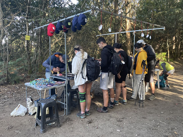 Heute früh hätte ich fast verschlafen. Als ich um viertel sieben aufgewacht bin, stand das junge deutsche Pärchen schon in der Tür und die anderen waren beim Einpacken. Ich habe auch schnell gepackt, aber dann eine Weile gebraucht, um die gestern Abend gewaschenen Sachen so am Rucksack zu befestigen, dass sie einerseits durch den Laufwind trocknen und andererseits nicht runterfallen. Um dreiviertel sieben war ich in der Spur. Da war es noch finster, allerdings gab es einen großartigen, wolkenlosen Sternenhimmel.
