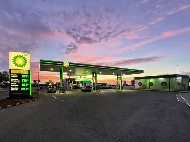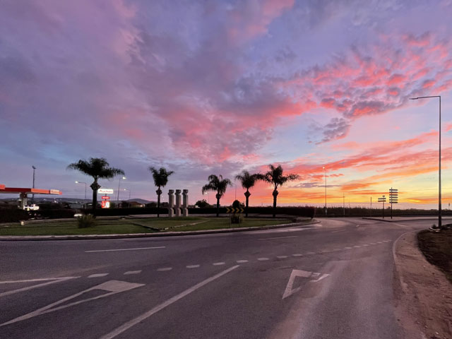 Ich habe mich noch ein paar Mal gedreht und bin dann raus, hab‘ gepackt, Kaffee aufgebrüht, was gegessen und mich dann kurz nach sechs auf den Weg gemacht. Da war es zwar noch dunkel, aber in der Stadt mit Laternen sollte das kein Problem sein. Ich habe aber nicht damit gerechnet, dass um 6.25 Uhr, exakt eine halbe Stunde vor Sonnenaufgang, die Laternen ausgeschaltet werden. Da war es erstmal wieder finster. Aber es war kein Problem, aus der Stadt herauszufinden. Inzwischen hellte ja der Himmel auf und die wenigen Dekowolken leuchteten hellrot vor blauem Grund. Ein schöner Anblick und ein Hinweis auf vermutlich angenehmes Wetter.