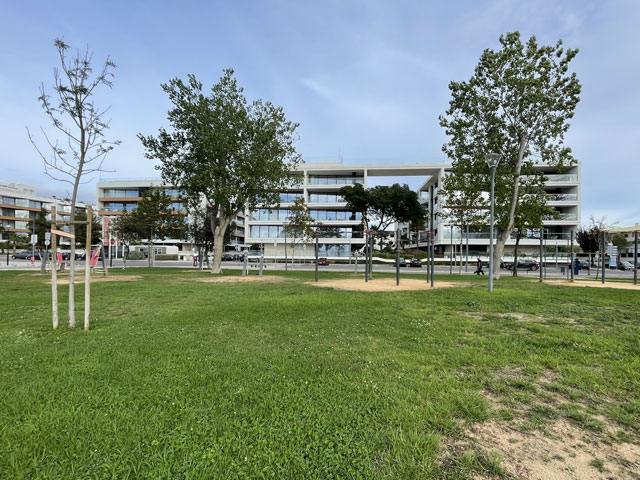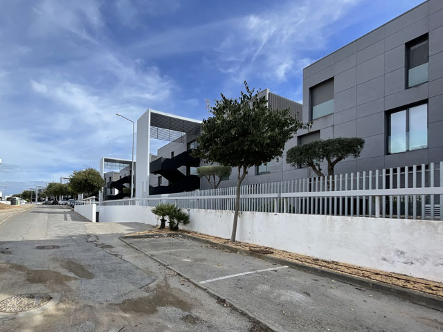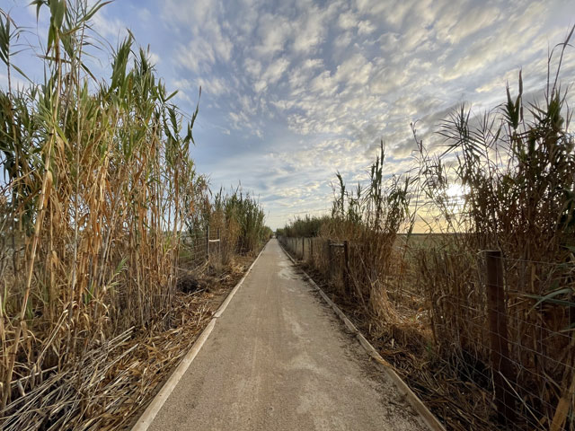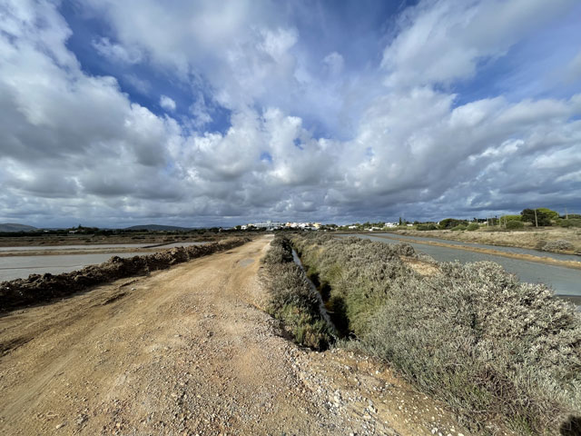 Noch im Ort muss man ein Stück weg von der Küstenlinie, weil der Fischereihafen von Olhão zu umrunden ist. Irgendwo muss ja der Fang an Land gebracht werden. Auf der anderen Straßenseite beginnt ein Gewerbegebiet, das sicher keinen touristischen Wert besitzt, aber sehr ordentlich ist und viele verschiedene Gewerke und Dienstleistungen beherbergt: Holz- und Metallbau, Autowerkstätten und -inspektionen. Konservenfabriken usw. Am Ende des Gewerbegebietes trifft man wieder auf die Bahnlinie und einen Fuß-/Radweg, der diese begleitet. Dieses Mal geht es zunächst auf einem beidseits eingezäunten Weg zwischen der Bahn und einem Naturpark. Später führt ein endlos langer, mit Geländern versehener hölzerner Steig durch die Salzwiesen, das heißt das Hinterland des Küstenstreifens, das noch von Ebbe und Flut betroffen ist und unzählige, nur mit kniehohem Bewuchs versehene Inselchen zu bieten hat.