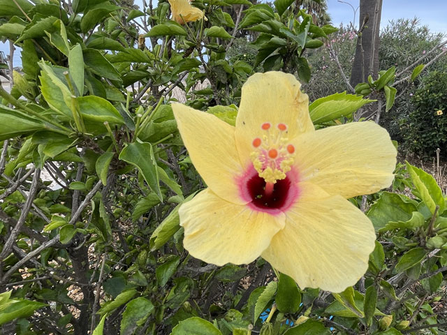 Hinter Fuseta muss man einen großen Bogen um die weit ins Land reichenden Salinen machen. Bis hier hatte ich mir Zeit gelassen, weil in der Jugendherberge von Tavira, in der ich morgens reserviert hatte, angeblich erst um sechs Einlass ist. Mein Routenplaner hatte mir am Vormittag noch gesagt, dass ich um vier da sein werde. Offenbar habe ich daraufhin zu viel gebummelt, denn als ich ihn jetzt nochmal befragte, hat er selbst für die kürzeste Strecke entlang der Straße sechs Uhr als Ankunft prophezeit. Der sicher schöne, aber im Zickzack verlaufende Radweg schied damit aus. Da ich nicht mehr als nötig an der Straße laufen wollte, habe ich mich für einen nur wenig längeren Weg durch die Plantagen entschieden. Letztere zeigten sich sehr unterschiedlich. Manche Obstplantagen (u. a. Zitronen, Orangen) waren sehr ordentlich, andere halb verwildert. Die Granatapfelbäume am Wegesrand haben ihrem Namen alle Ehre gemacht, denn viele überreife Früchte waren regelrecht explodiert. Die werden offenbar außer von Passanten gar nicht abgeerntet. Da hingen noch wunderschöne Früchte dran, etwas höher auch knallrote, wie man sie aus Prospekten kennt. Am Weg, der sich an den Siedlungen vorbeischlängelt fanden sich auch zwei Wein-„berge“, einer noch ganz grün, der andere mit herbstlichen Laub.