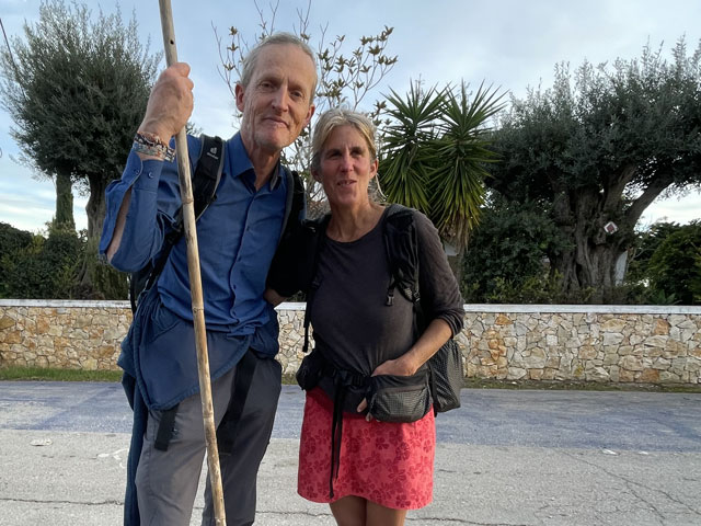 Etwa fünf Kilometer vorm Ziel, da wo der Weg an der Siedlung Pedras d‘el Rei eine Straße kreuzt, habe ich ein Pärchen bemerkt, das rechts vom Strand kam. Die beiden hatten zwar nur kleine Rucksäcke dabei, kamen mir aber trotzdem verdächtig vor, weshalb ich vorsichtshalber gewinkt habe. Dann habe ich mir beim Leeren und Entsorgen meiner Wasserflasche so viel Zeit gelassen, bis die Beiden ran waren. Die kamen dann auch prompt zu mir und meiner Mülltonne geeilt und haben auf meine ihnen auf Deutsch zugerufenen Begrüßung wie vermutet auf Deutsch geantwortet. Es sind Britta und Thomas aus Dortmund, die mir in die Arme gelaufen sind. Die wollten eigentlich auf den Camino, der durch das Landesinnere von Portugal führt (Via Portugal Nascente), aber wegen des schlechten Wetters am Weg haben sie ihr Zelt, das sie unabhängig macht, hier auf einem Zeltplatz aufgeschlagen und machen zunächst ein paar Tagestouren. Britta und Thomas sind passionierte Pilger und kennen in Spanien und Portugal so ziemlich alle Wege und sind einige schon wiederholt gelaufen. Sie waren auch schon auf dem Weg von Huelva nach Zafra und wunderten sich, dass ich Mühe hatte, dort Quartiere ausfindig zu machen. Sie hätten da überall Herbergen gefunden. Ich lass mich überraschen, würde mich aber nicht wundern, wenn die Herbergen mangels Pilgern alle wieder geschlossen hätten.