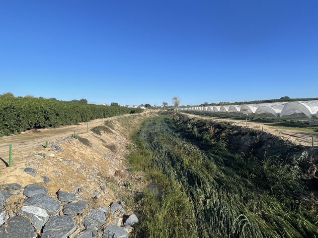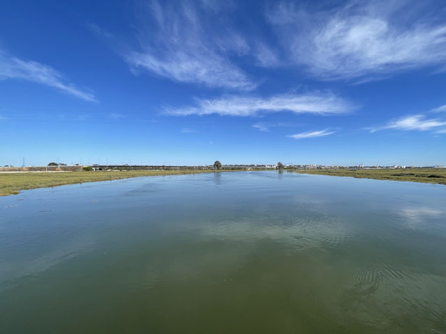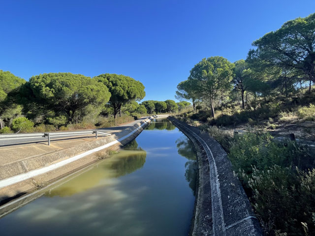 Bis zum nächsten Ort, Cartaya hätte man wieder auf den Radweg entlang des ehemaligen Bahndamms wechseln könne. Der macht aber einen großen Bogen nach Norden, um auf einer eigenen Brücke den Río Piedras zu überqueren. Da die N-431 außerhalb der Stadt einen breiten Standstreifen hat und es mittlerweile hell war, bin ich auf der Straße geblieben, was eineinhalb Kilometer gespart hat. Da wo die Straße den Río Piedras überquert, ist dieser nur ein schmaler Bach, der so zugewachsen ist, dass man das Wasser kaum sehen kann.
