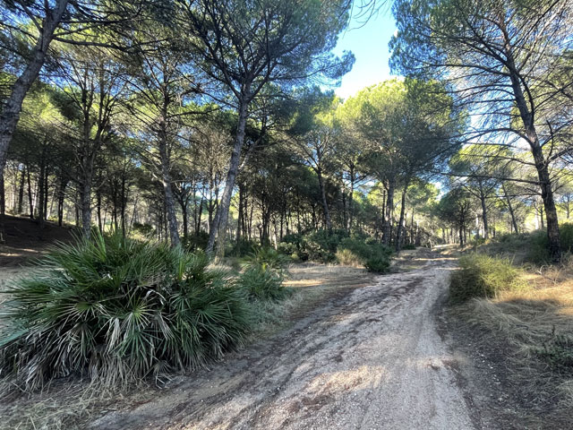 Hinter der Siedlung wurde es spannend, denn da bog die Straße ab und ich musste in den Wald, um halbwegs die Luftlinie einzuhalten. Das erwies sich dann aber als unproblematisch. Der in der Karte einge-zeichnete Weg war ein befahrbarer Forstweg. Der Pinienwald war recht licht und damit hell. Da, wo gestern Kakteen unter den Bäumen standen, waren es heute Palmwedel. Es hat richtigen Spaß gemacht, da zu laufen. Man musste nur bei jeder Wegkreuzung die Karte konsultieren, weil hier nichts ausgeschildert ist und die Wegbeschaffenheit nicht unbedingt mit der Darstellung des Weges auf der Karte korreliert. Im Wald ist mitunter das, was als schmale Straße eingezeichnet ist, kaum mit dem Mountainbike zu bewältigen und ein gestrichelt eingezeichneter Weg kann so glatt und breit sein, dass da zwei LKW aneinander vorbeikommen.