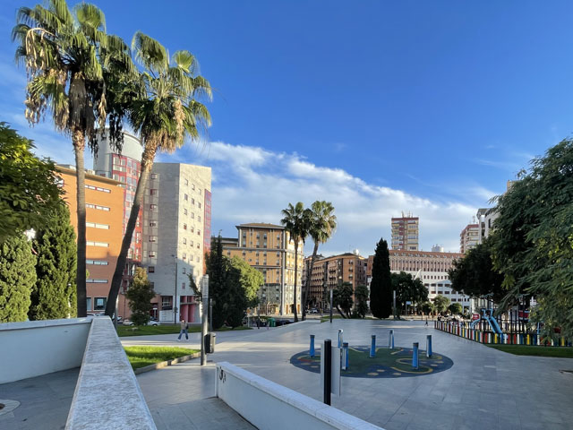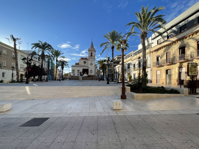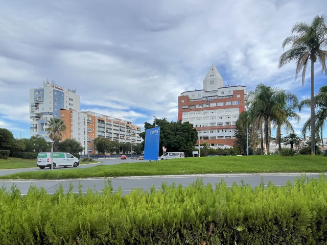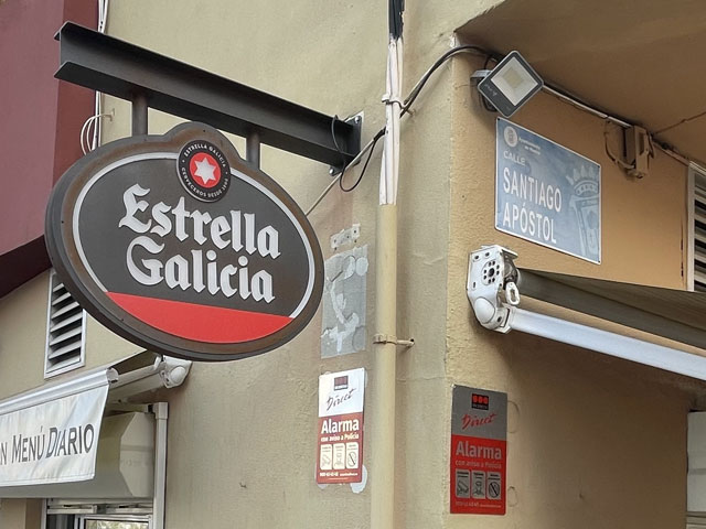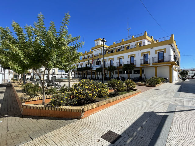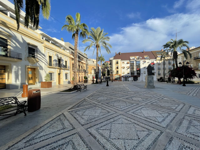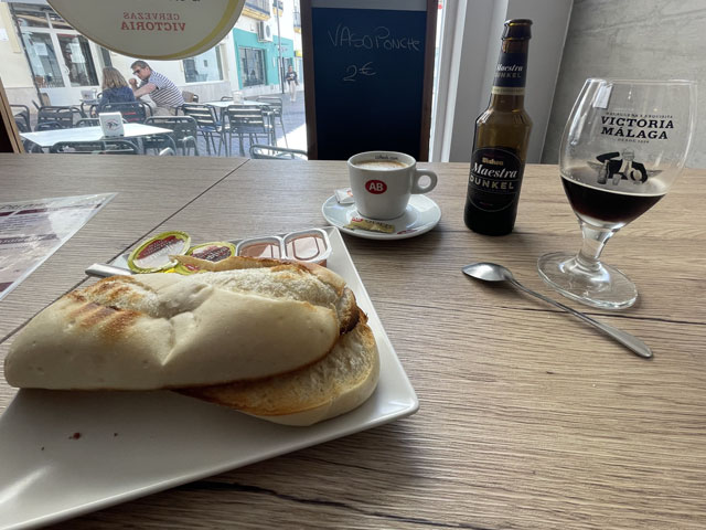 Ich bin gut und schnell vorangekommen und wie erhofft an einer Stelle auf den Kanal (Canal del Piedras) getroffen, wo eine Brücke rüber führt. Ein Stück ging es entlang des Kanals und dann bei nächster Gelegenheit wieder links weg. Diese Straße tritt bald aus dem Wald raus und wird dann links von Fincas und rechts von Plantagen begleitet. Geradezu ist schon der kleine Berg zu sehen, auf dem sich das Städtchen Aljaraque befindet. Den hätte man auf der Straße umrunden und sich damit den Aufstieg sparen können, aber mich hat das Kirchlein auf dem „Gipfel“ gereizt, dessen Turm über den Häuser herausragte. Die Kirche war natürlich zu, aber ein Stück weiter war das Rathaus offen, so dass ich mir da einen Stempel holen konnte. Gestern im Hotel gab es nämlich keinen. Da ich sehr gut in der Zeit lag, bin ich in eine Seitenstraße abgebogen und habe mir da in einer Gaststätte einen Kaffee, Tomaten-Toast und Bier kommen lassen - nicht, ohne vorher zu prüfen, ob es auch eine Steckdose zum Aufladen des Smartphones gibt. Den frischen Strom habe ich gleich genutzt, um noch mal nach Quartieren in Huelva zu schauen. Ich hatte nämlich noch nichts gebucht. Bei meinen Recherchen vor der Abreise hatte ich in Huelva drei Hostels mit 26…28 € gefunden und gemeint, in einem davon absteigen zu können.