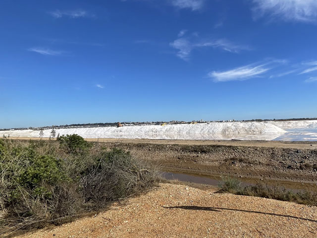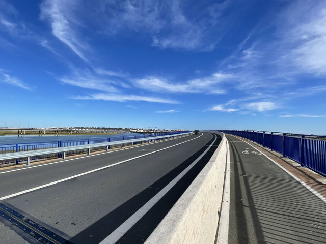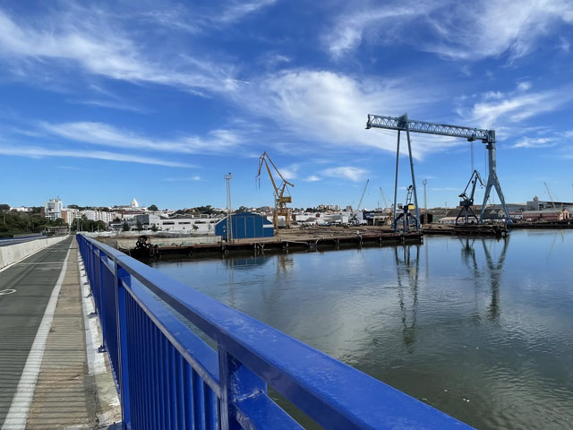 Von Aljaraque aus war mein Ziel, Huelva, längst zu sehen. Jenseits eines breiten Flussdeltas geradezu hohe, helle Häuser und nach rechts, zum Meer hin, zunehmend Hafen- und Industrieanlagen. Als Weg in die Stadt hinein habe ich den Radweg gewählt, der südlich der direkten Verbindung in einem Bogen durch die Salzwiesen verläuft und dabei dem Río de Aljaraque folgt, der kurz vor Erreichen von Huelva in den Río Odiel mündet. Über diese Mündung spannen sich zwei nebeneinanderliegende Brücken. Eine für die Autobahn A-497 und eine für die Straße VM-497. Der Radweg folgt letzterer zunächst ebenerdig, dann geht es auf einem von der Fahrbahn massiv getrennten Streifen auf der Brücke weiter. Von oben ergibt sich in alle Richtungen ein grandioser Blick, zum Beispiel nach rechts auf eine alte Eisenbahn-Verladerampe, die weit in den Río Odiel hineinragt, damit dort auch Schiffe mit großem Tiefgang beladen werden können. Jetzt kann man da zu Fuß oder mit dem Rad seine Erkundungen machen.