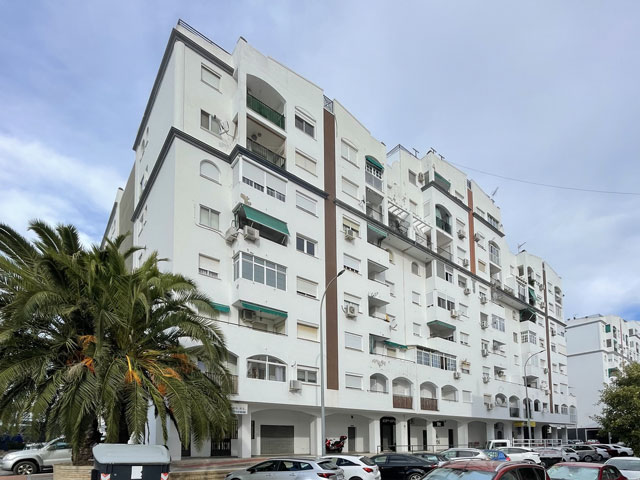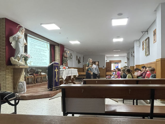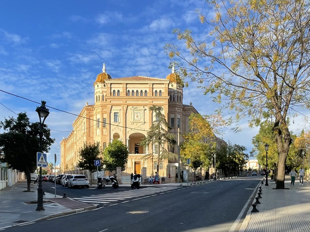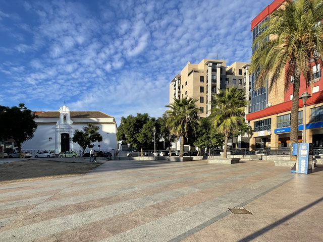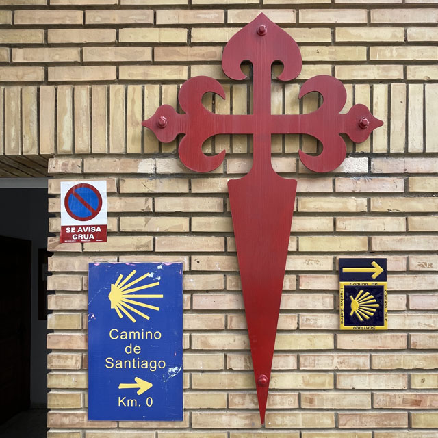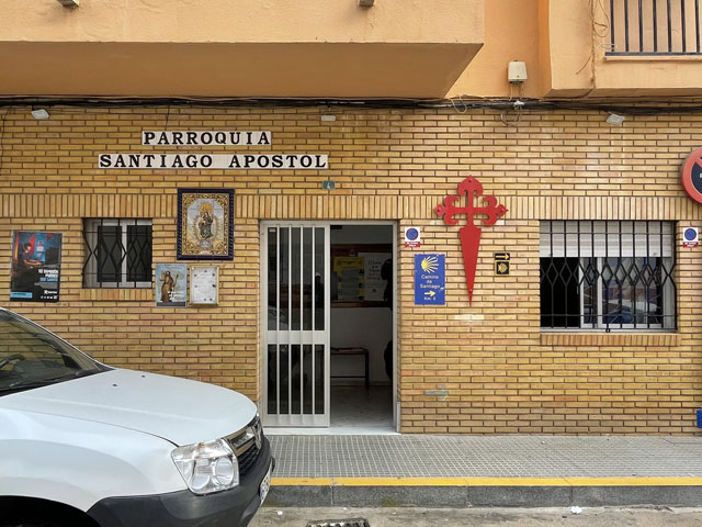 Nicht weit vom Brückenkopf ist die Kirche „Santiago Apostol“, wo offiziell der Camino del Sur beginnt. Da wollte ich natürlich unbedingt hin, um mir einen Stempel zu holen und ganz offiziell dort zu starten. Die Kirche liegt in einem schon etwas in die Jahre gekommenen Neubaugebiet und ist gar nicht so leicht zu finden. Es ist nämlich kein freistehendes oder in die Häuserreihe eingefügtes Gebäude, sondern eher ein Laden, der sich neben Geschäften, Sportstudios usw. im Erdgeschoss eines Wohnhauses befindet. Darin ist ein Gottesdienst-raum, der auch für den Religionsunterricht der Kinder benutzt wird. In eine solche Unterrichtsstunde bin ich im wahrsten Sinne des Wortes hineingestolpert, denn am Eingang waren die Schulmappen aufgereiht. Eine der beiden Betreuerinnen, die den Beamer bediente, ist zu mir gekommen und dann in einen Nebenraum verschwunden, um den Stempel zu holen. Die andere hat den Kindern kurz erklärt, was es mit der Muschel auf sich hat, und als ich wieder ausgebrochen bin, haben mir alle nachgewinkt. Ein schöner Start!