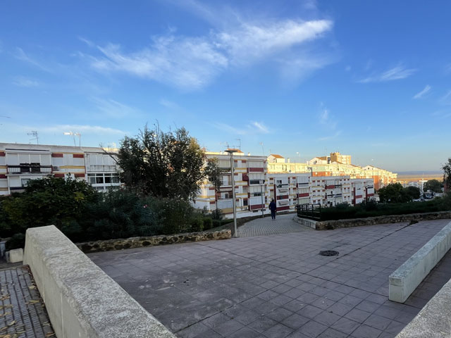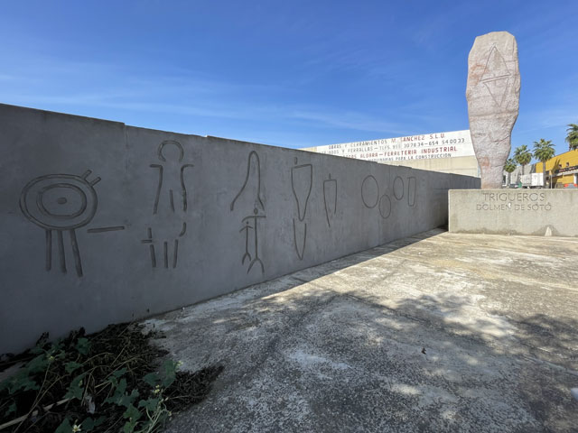 Hinter den Solaranlagen gab es für den Rest des Weges links und rechts nur noch abgeerntete Felder, bei denen die Stoppeln aus der Erde ragten. Ich habe vor dem Ziel einen Abzweig des Jakobsweges übersehen und bin am Südrand von Trigueros an der N-435a rausgekommen, kurz bevor die in den Ort hineinführende Straße abzweigt. Das traf sich gut, weil dort gegenüber der Tankstelle der vermutlich einzige große Supermarkt („Dia“) liegt. Da dieser keine Mittagspause macht, konnte ich mir was für ein Picknick im angrenzenden Park kaufen.