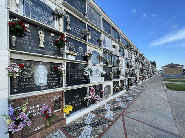 Die ersten ca. 5 km verliefen entlang einer Straße, die zwar nur mäßig befahren war, auf der es aber trotzdem besser war, auf dem Trampelpfad neben dem Asphalt zu laufen, um nicht von hinten von den überholenden Fahrzeugen mitgenommen zu werden. Zu sehen gab es links und rechts nicht viel, nur einen großen, im Halbkreis angelegten Friedhof, den ich auch kurz besichtigt habe. Die Blumenhändler haben gerade ihr Sortiment ausgepackt. Das waren alles Kunstblumen, riesig groß und furchtbar bunt. Damit waren auch auf dem Friedhof fast alle Gräber und Sarg- bzw. Urnen-„Schließfächer“ geschmückt. Das muss man nicht schön finden.