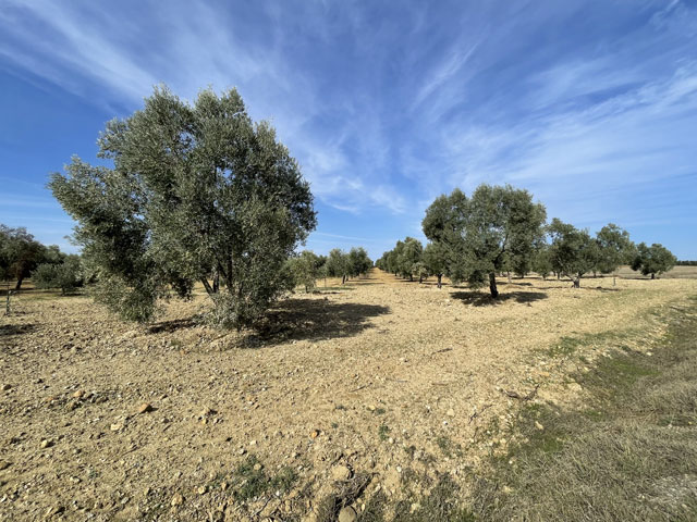 Nach dem Überqueren einer Eisenbahnlinie stößt die Straße auf die N-431, auf der 600 m nach rechts der kleine Ort La Ribera liegt, der eine Gaststätte hat. Da es inzwischen Mittagszeit war und auch im weiteren Verlauf der Straße keine Gaststätte kommt, habe ich den kleinen Umweg gemacht und bin in La Ribera eingekehrt - wie immer zu Tomaten-Toast, Bier und Kaffee, alles zusammen für 4,70 €. Hier ist die Welt noch in Ordnung. Zum Sattwerden hat mir das völlig gereicht. Zurück zur ursprünglich gelaufenen Straße und weiter in deren Verlauf ging es über die Autobahn. Bald danach macht die Straße einen Knick nach rechts und links zweigt eine schmale, kaum genutzte Straße ab, auf welcher der Jakobsweg verläuft. Da ging es zunächst zwischen zwei riesigen Solarfeldern hindurch. Das waren die ersten großen Solaranlagen, die ich hier in Spanien zu sehen bekommen habe. Ich habe mich schon so oft geärgert, dass wir auf jedem dunklen Hinterhof Balkonkraftwerke installieren sollen und hier die brennende Sonne ungenutzt bleibt.