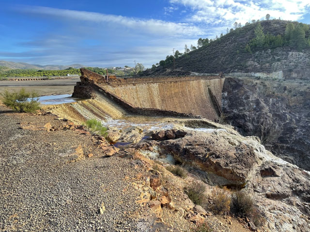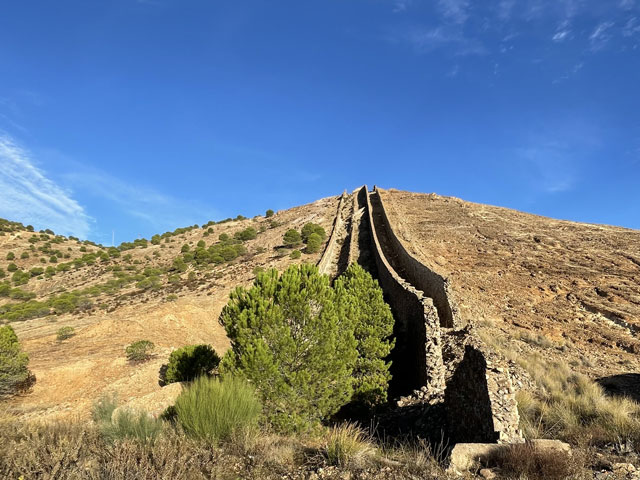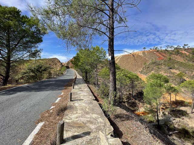 Der Weg führte von der A-476 weg und einen kleinen Abhang hinab zu einer kleinen, kaum befahrene Straße, die in einem Bogen nach Nerva führt. Hinter einer Kurve sehe ich plötzlich am Berghang die Chinesische Mauer. Zumindest sieht das Gebilde, dass sich von der Straße bis zur Kuppe hinzieht, so aus. Und beim Näherkommen, sieht man dann noch alles doppelt, denn es ziehen sich zwei „Chinesische Mauern“ den Berg hoch. So ganz erschließt sich für mich nicht der Sinn. Aber da auf der anderen Straßenseite Reste von Industrieanlagen und Gleise zu sehen sind, vermute ich, dass in den „Chinesischen Mauern“ Material, das im oder hinter dem Berg gefördert wurde, nach unten zu den Anlagen transportiert und dort weiter verarbeitet wurde. Da einige der Ruinen aus Beton sind, kann das alles noch nicht so richtig alt sein. Leider war nirgendwo ein Schild zu sehen, auf dem dazu mal was erklärt wird.